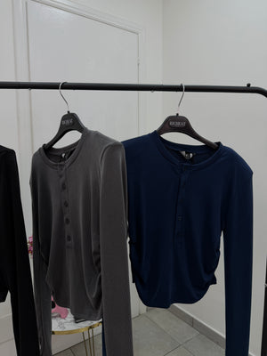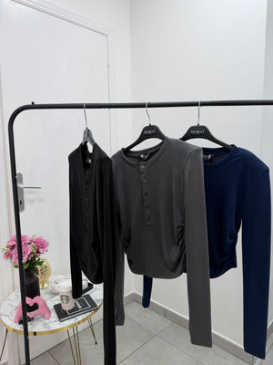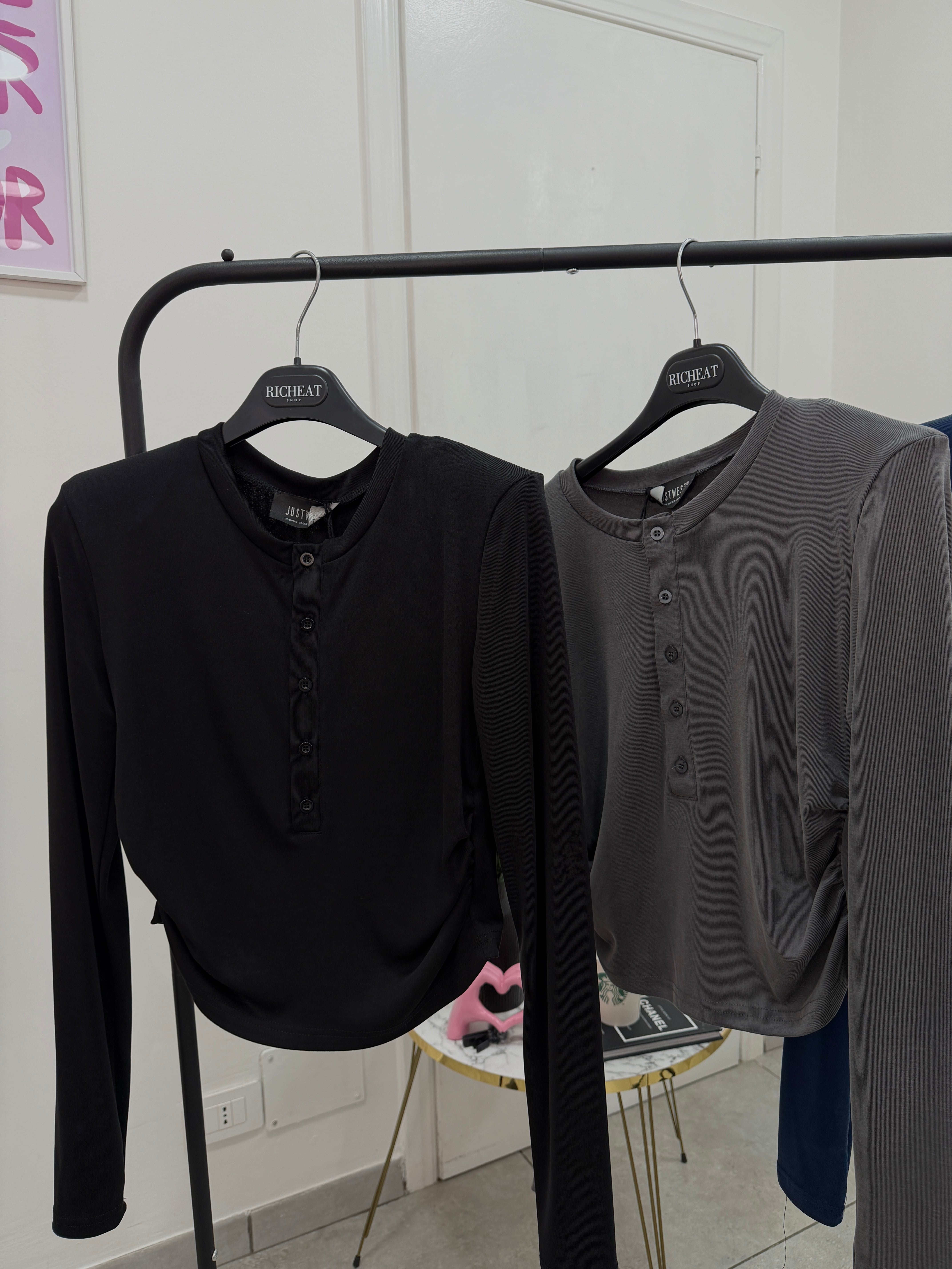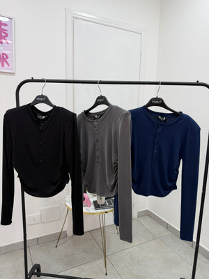 Maglia serafino Just West crop con bottoncini, drappeggi laterali, spalline imbottite.