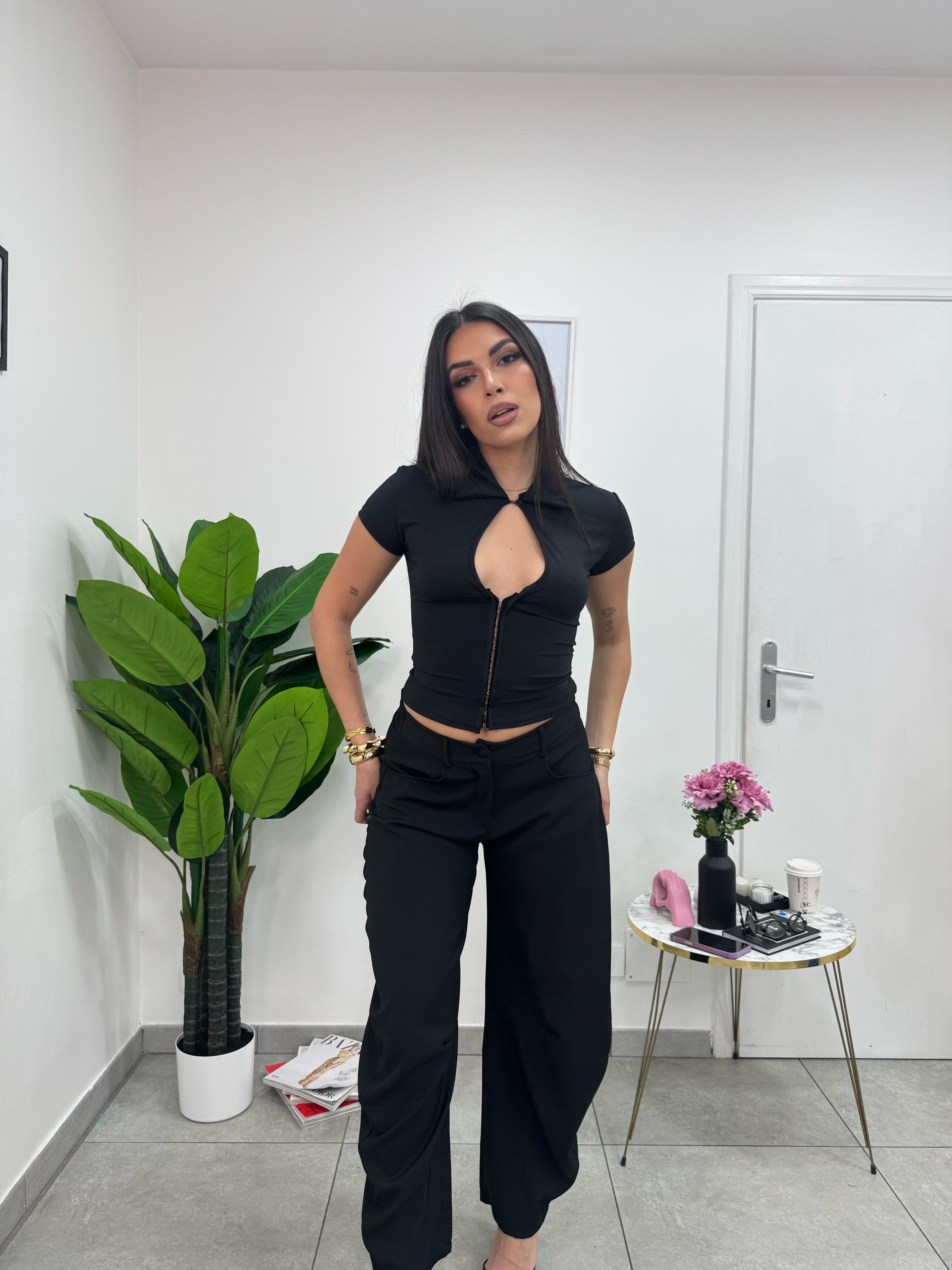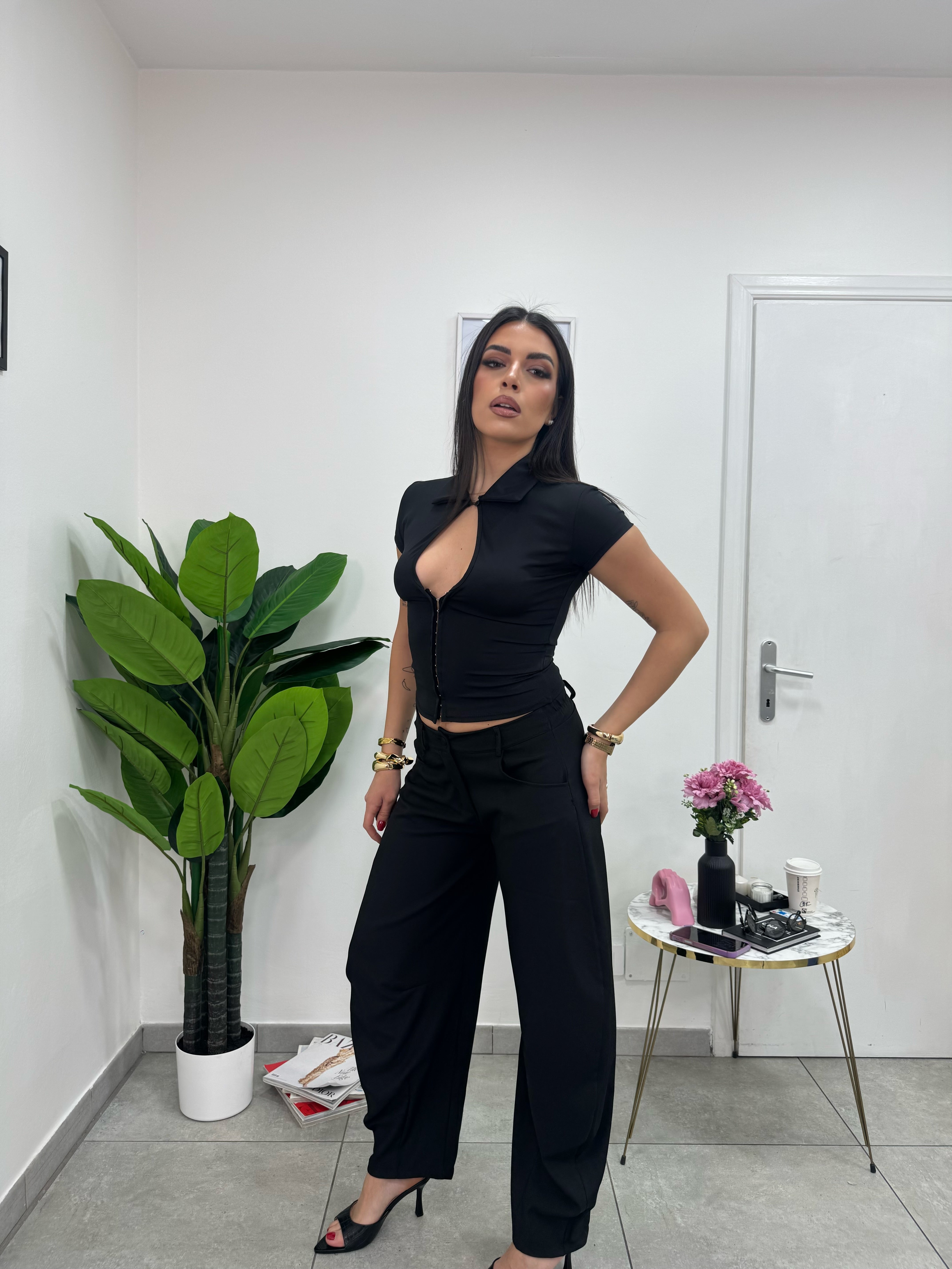 Top polo con scollo ad oblò e ganci in vita effetto corsetto.