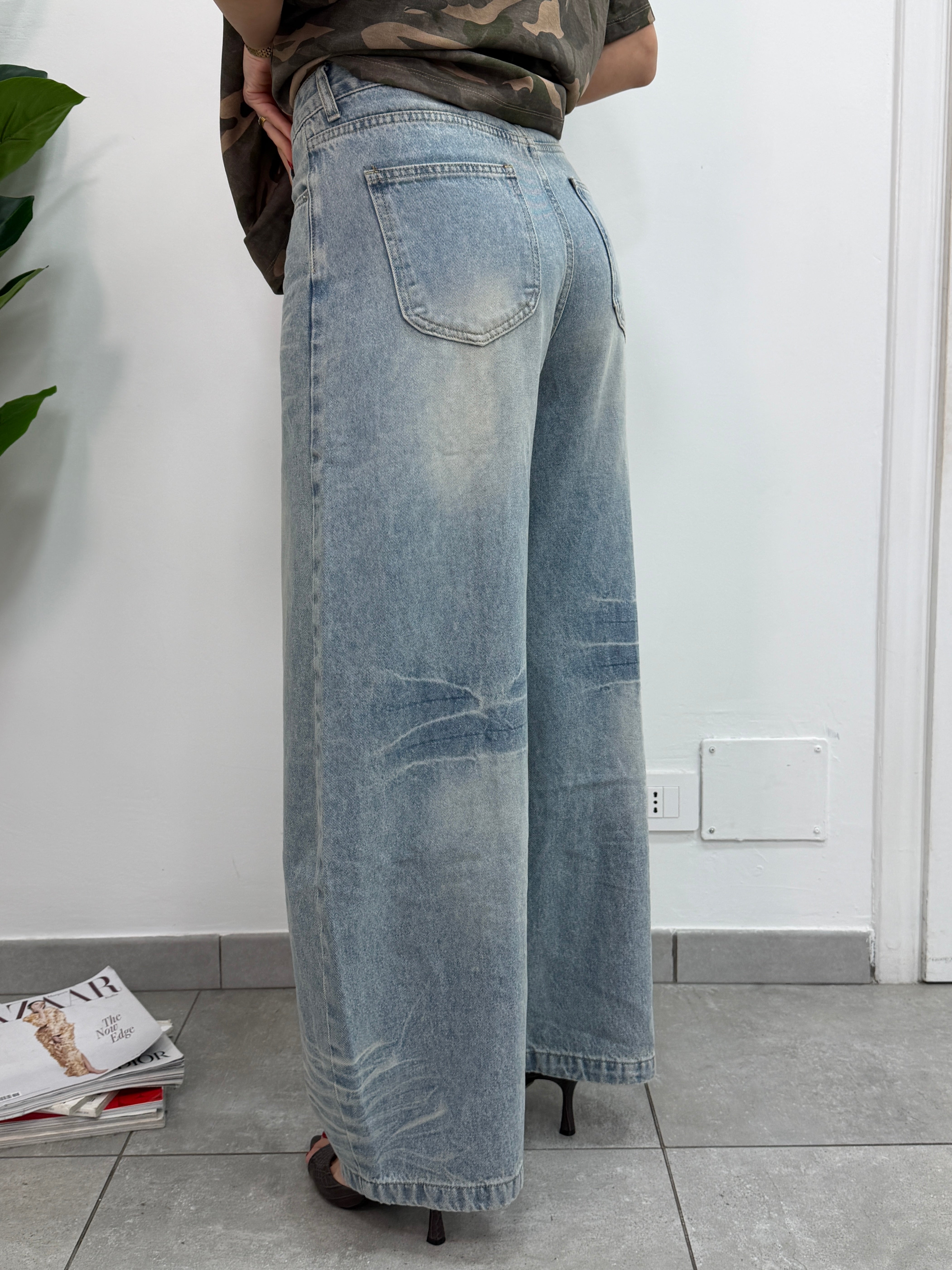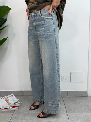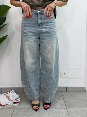 Jeans modello balloon con lavaggio vintage e cuciture centrali.