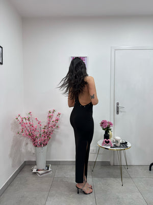 Abito lungo scollato con dettagli borchie sul bordo sia anteriore che posteriore, spacco laterale.