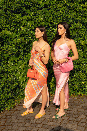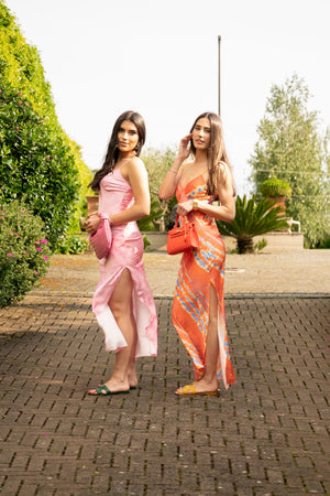 Abito satin multicolor, spacco laterale, spalline regolabili. Senza coppe.
