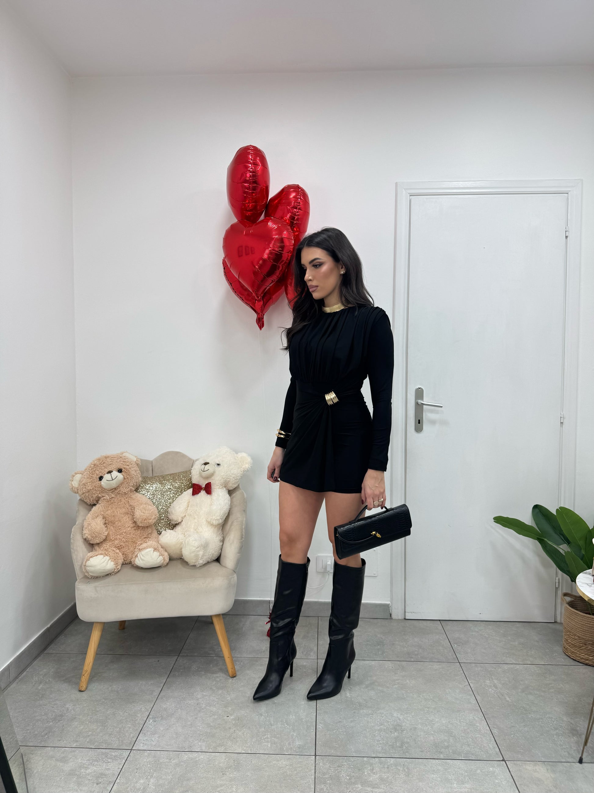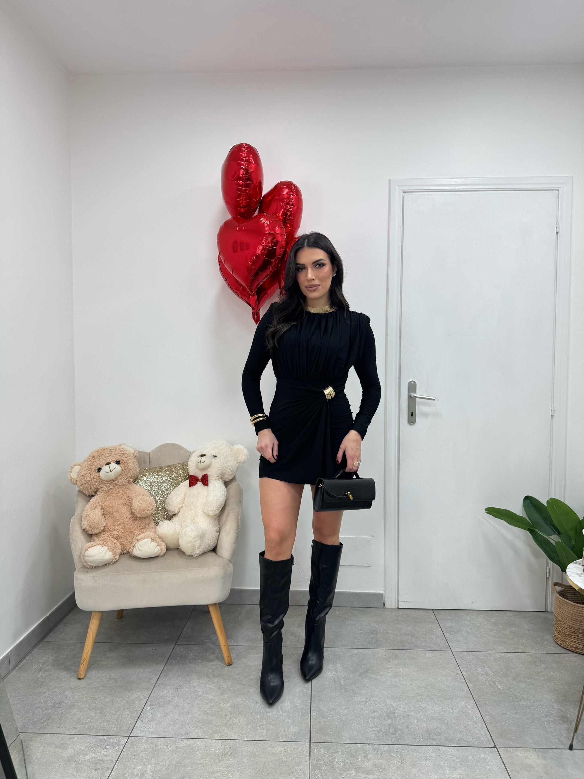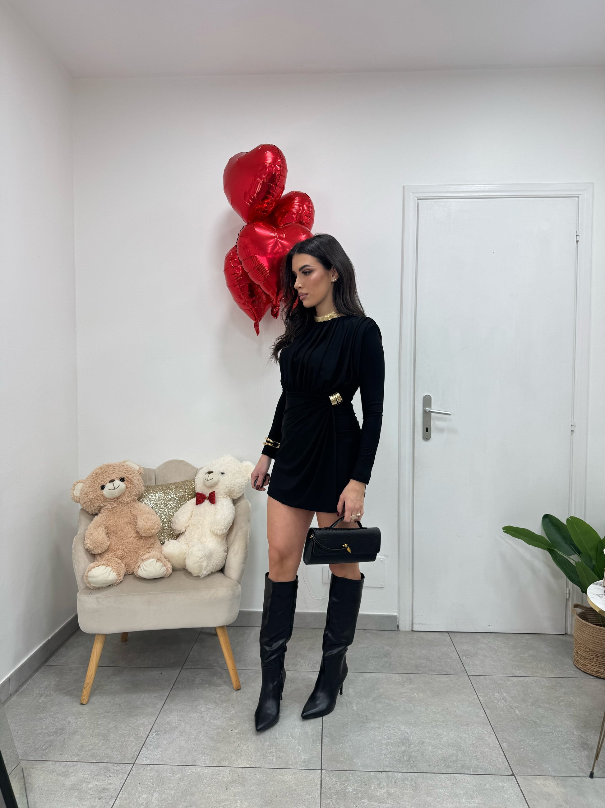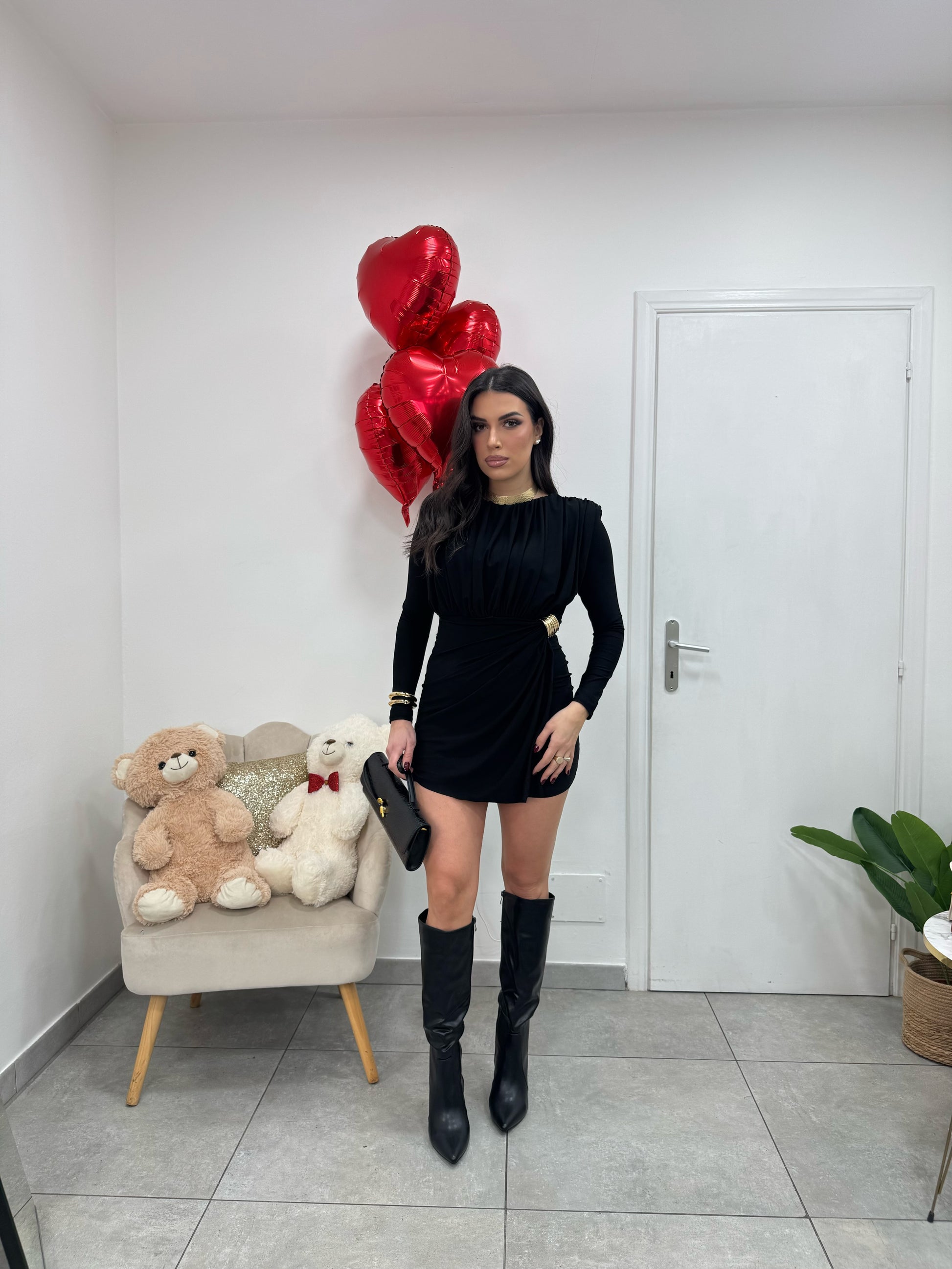 Abito tinta unita manica lunga, con drappeggi sulle spalle, fibbia oro laterale.