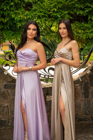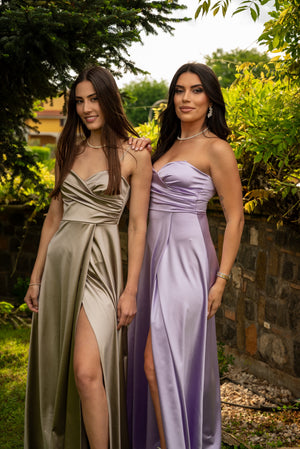 Abito lungo con scollo a cuore incrociato, spalline regolabili, coppe preformate. Spacco alto frontale.