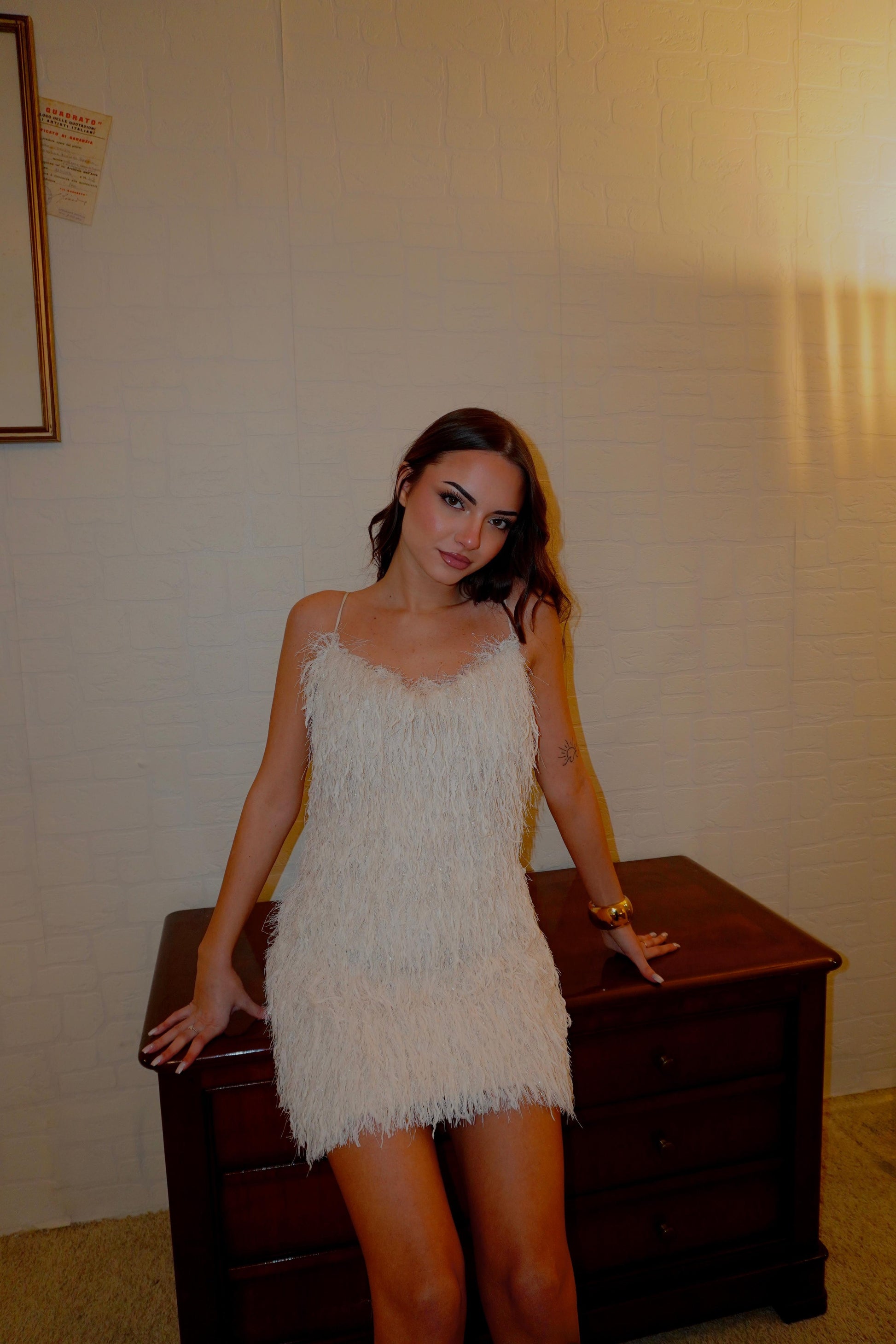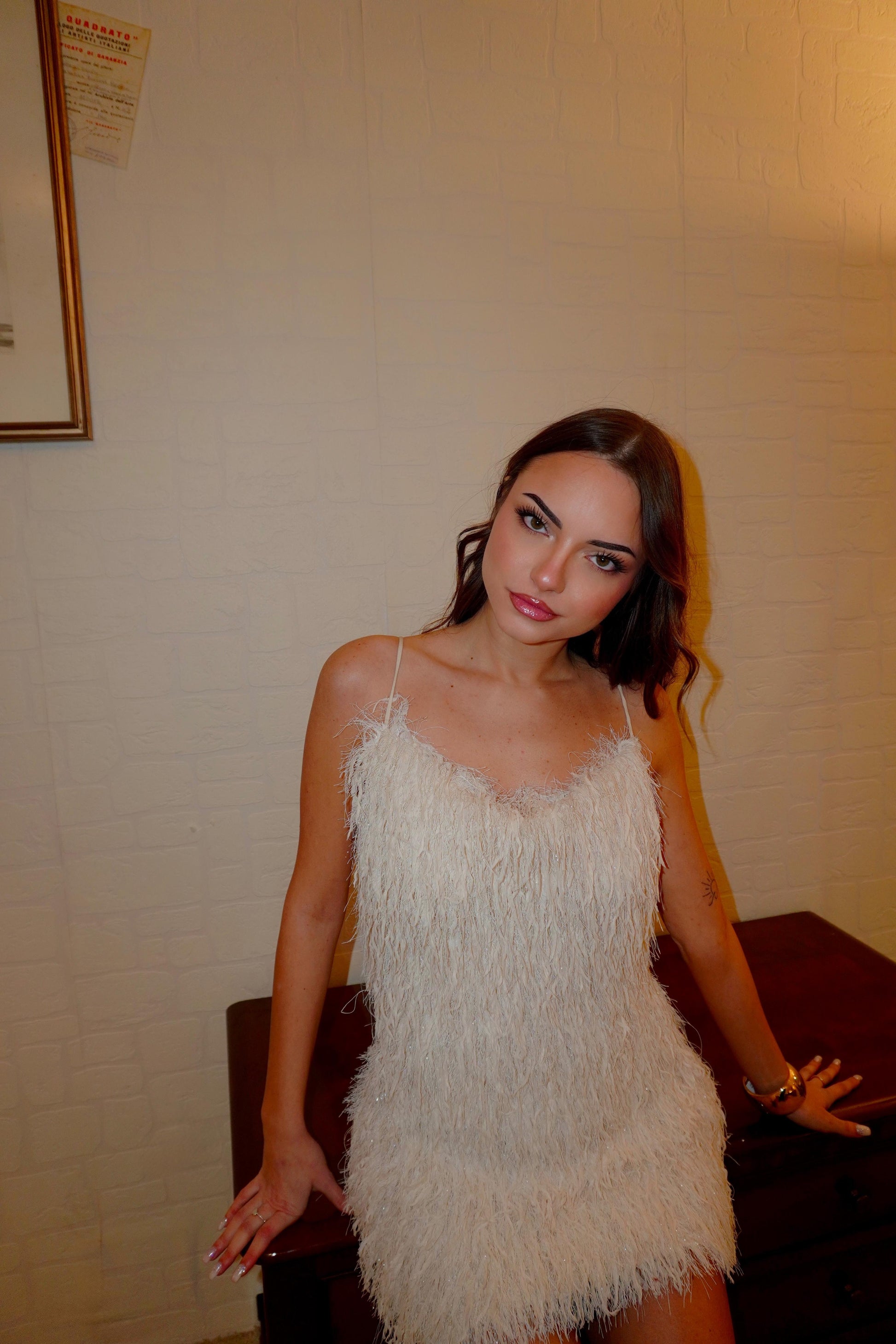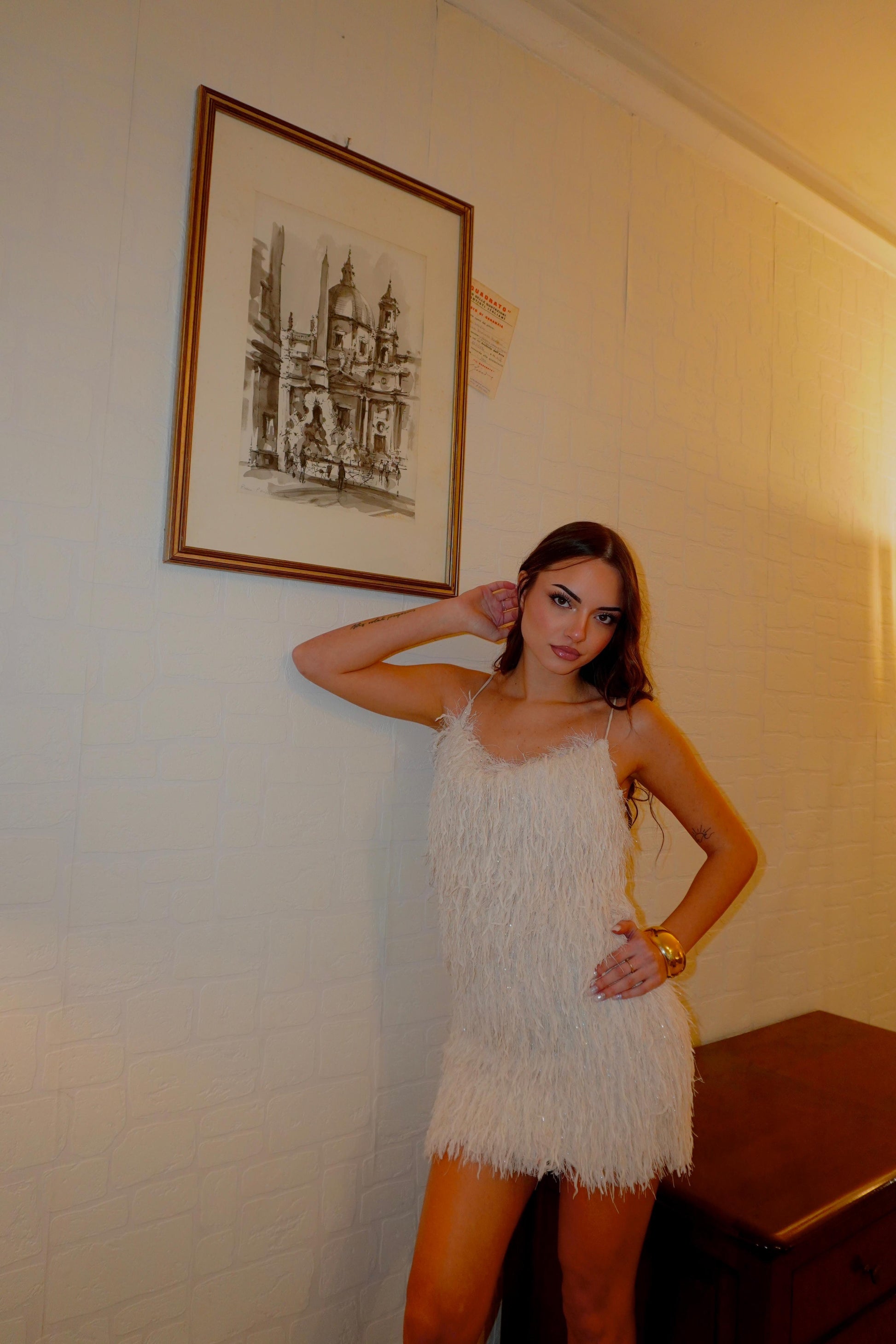 Mini abito ricoperto di piume e fili lurex è con spalline elasticizzate.