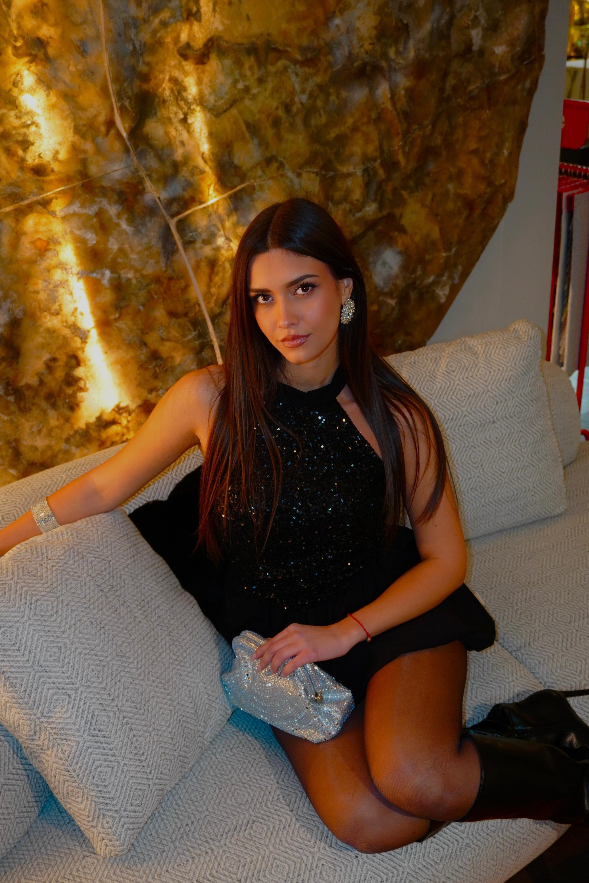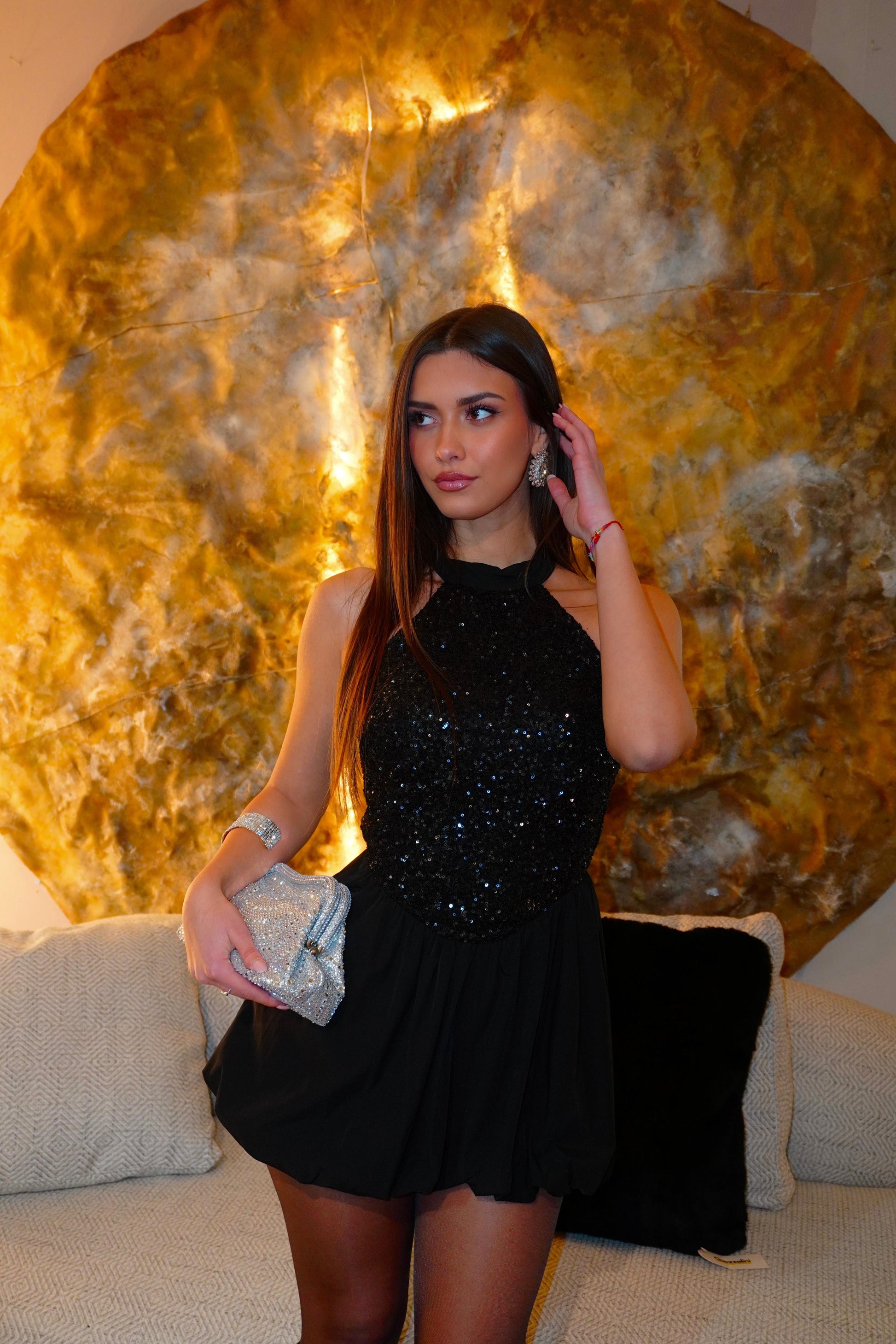 Mini abito con gonna a palloncino e busto ricoperto di paillettes, coppe preformate e bottoni dietro al collo.