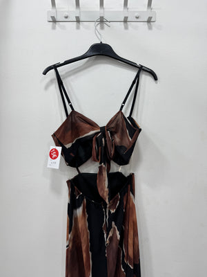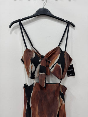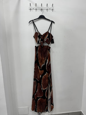 Abito lungo scollato asimmetrico, spalline regolabili, lampo dietro. Coppe preformate, foderato sotto. Spacco laterale.