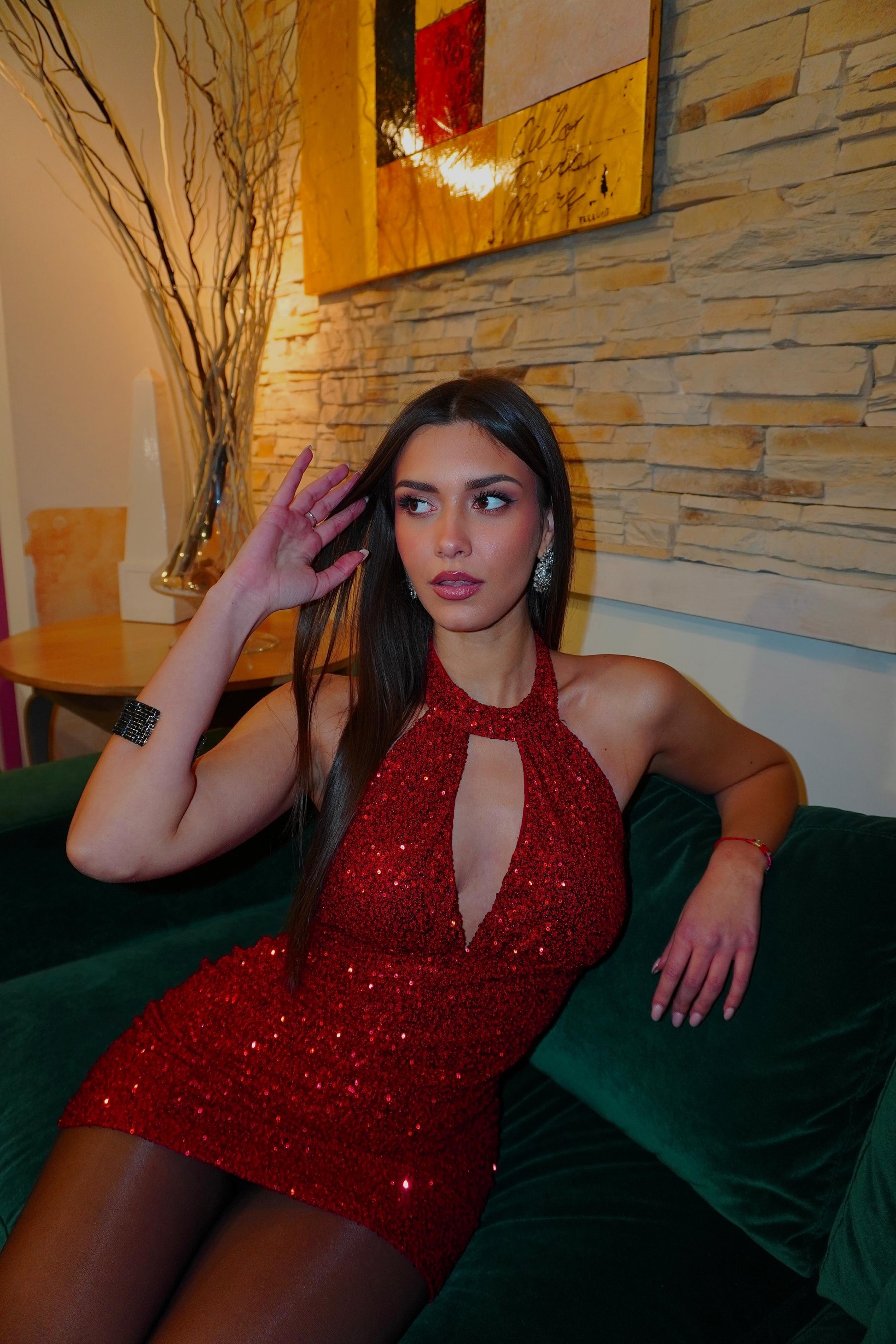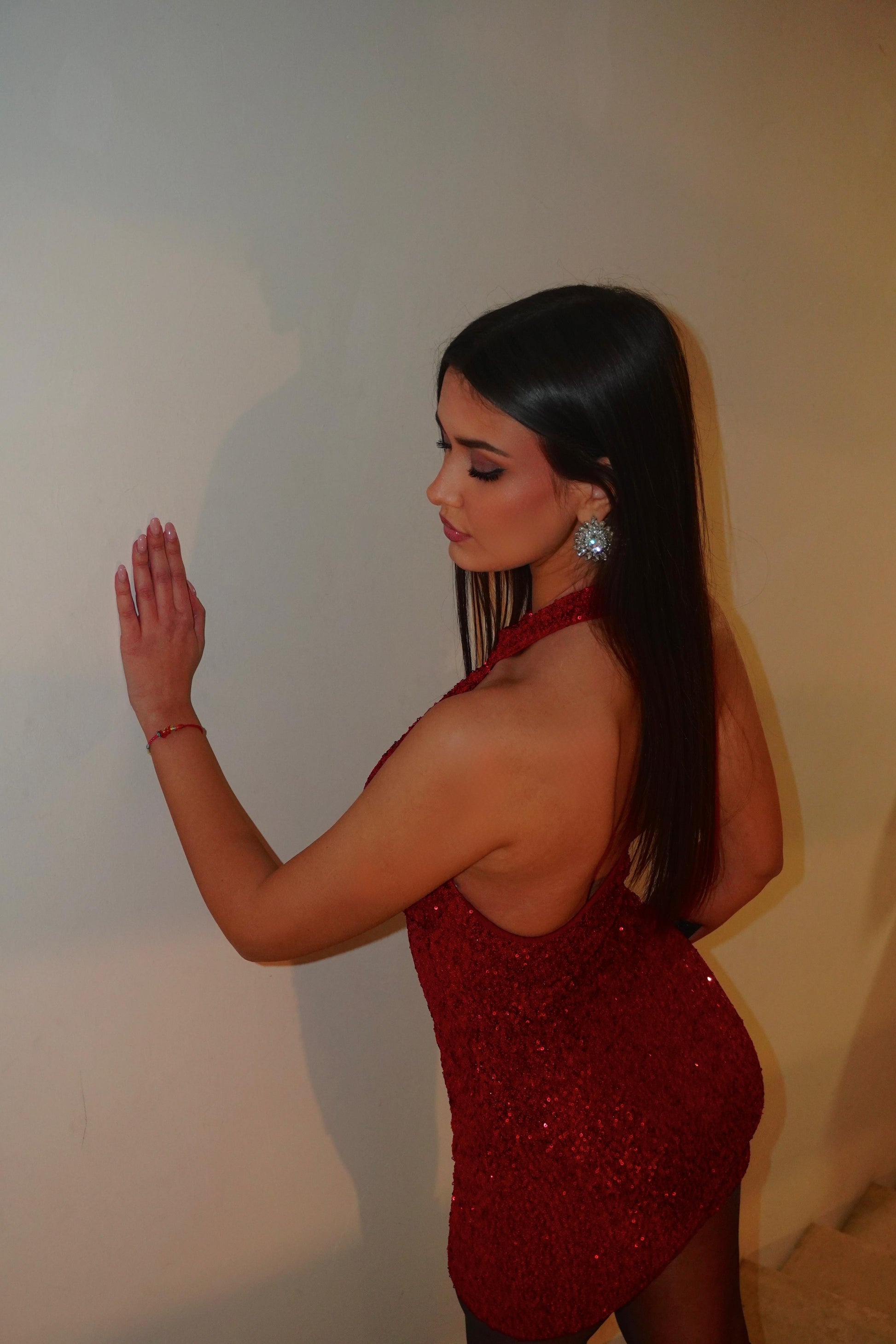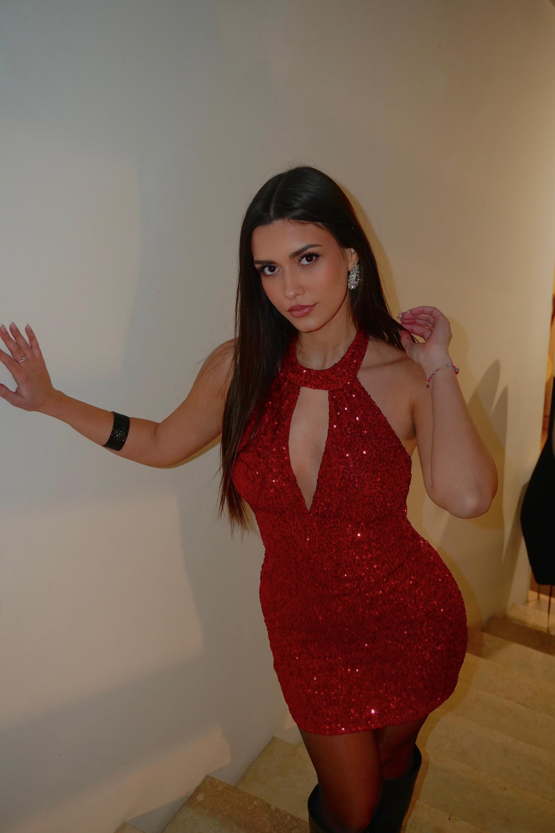 Mini abito ricoperto di paillettes con scollo all’americana, fodera interna, coppe preformate, schiena scoperta e bottoni dietro al collo.