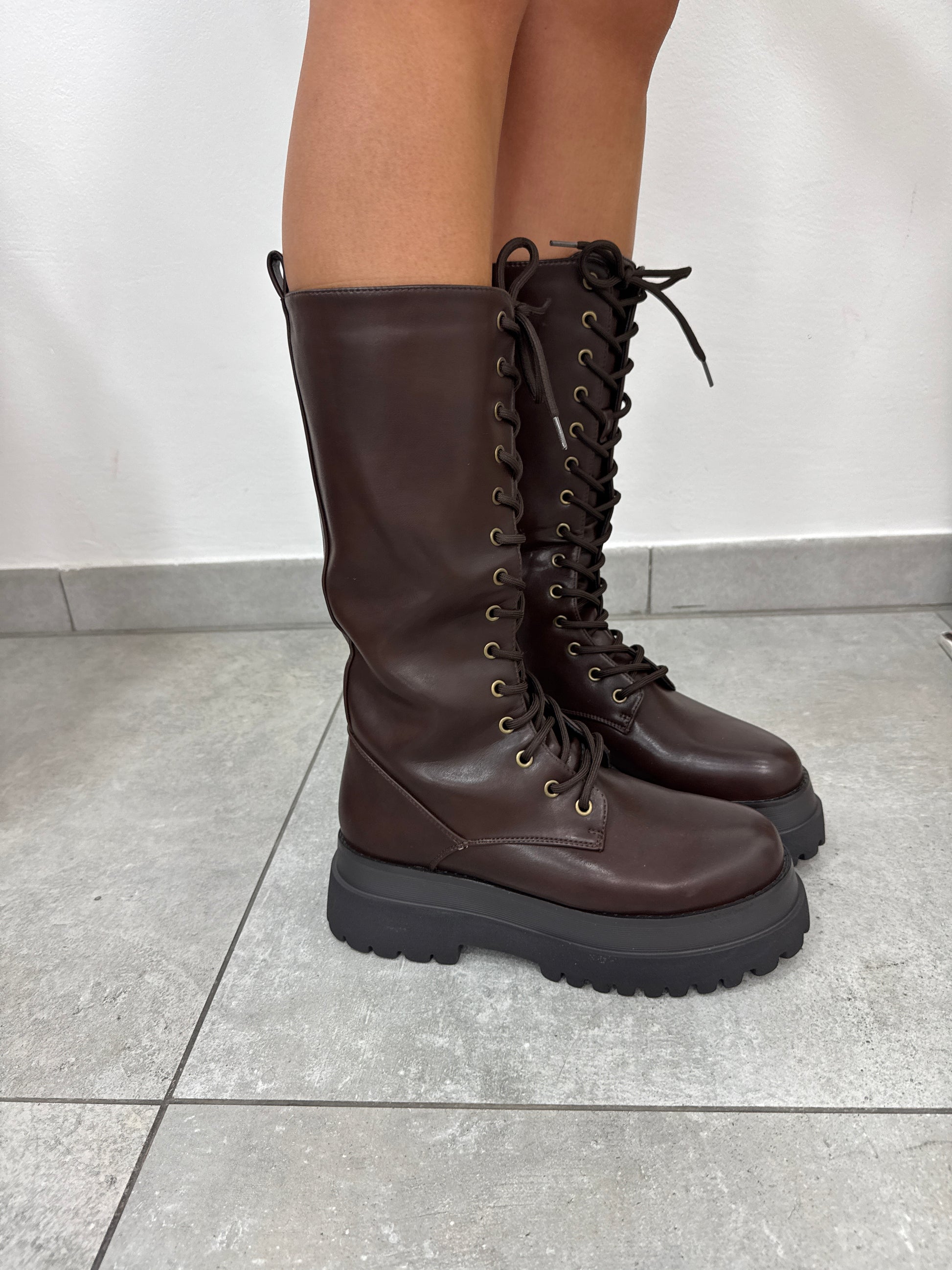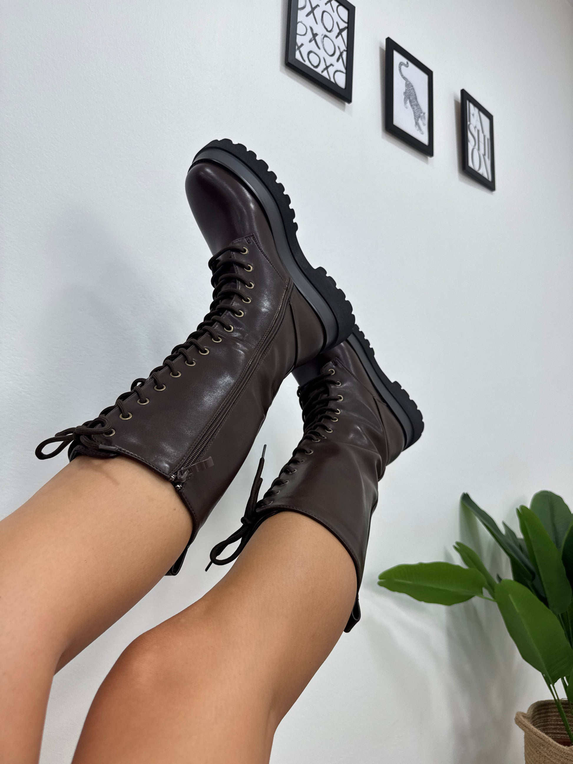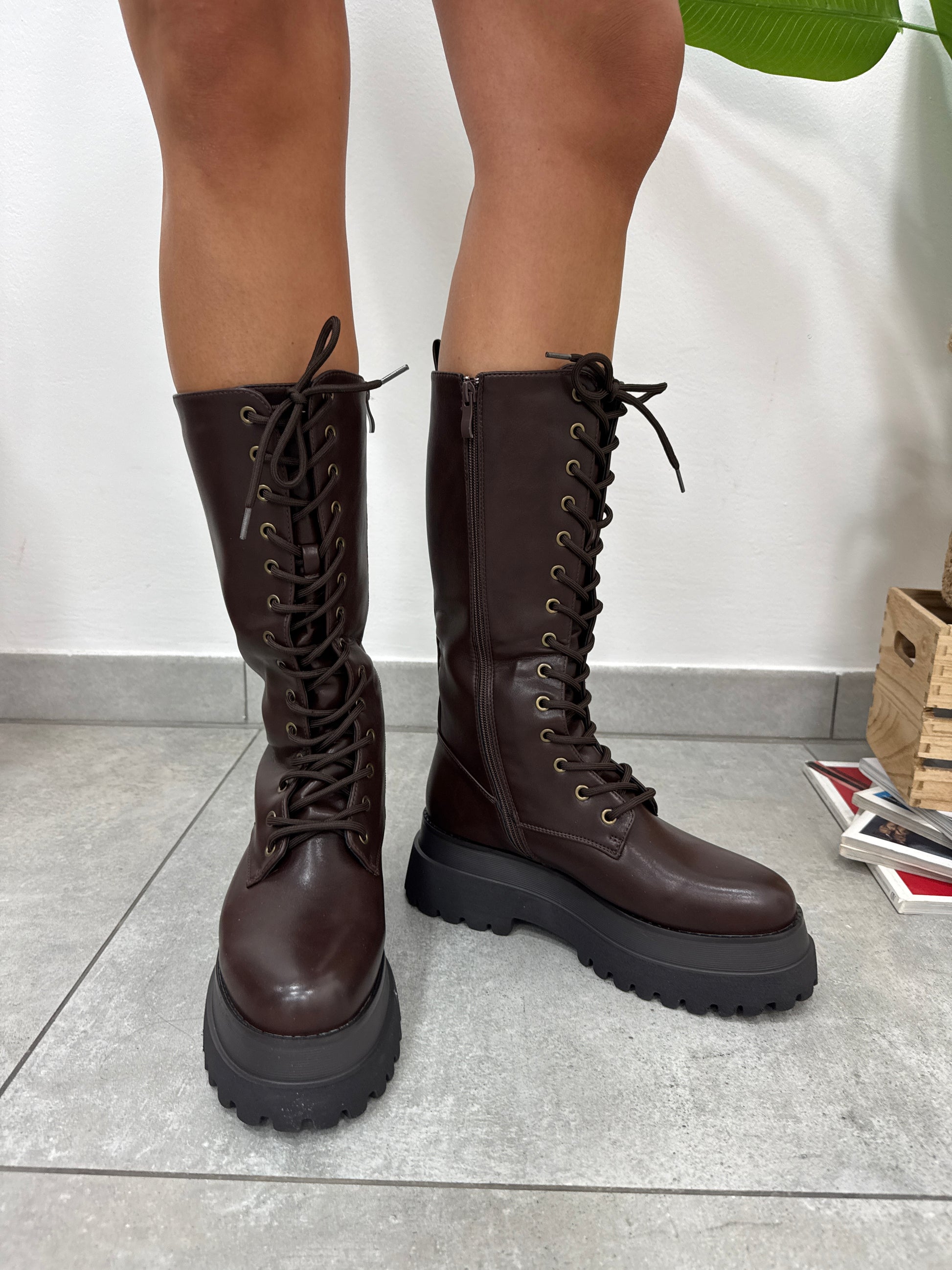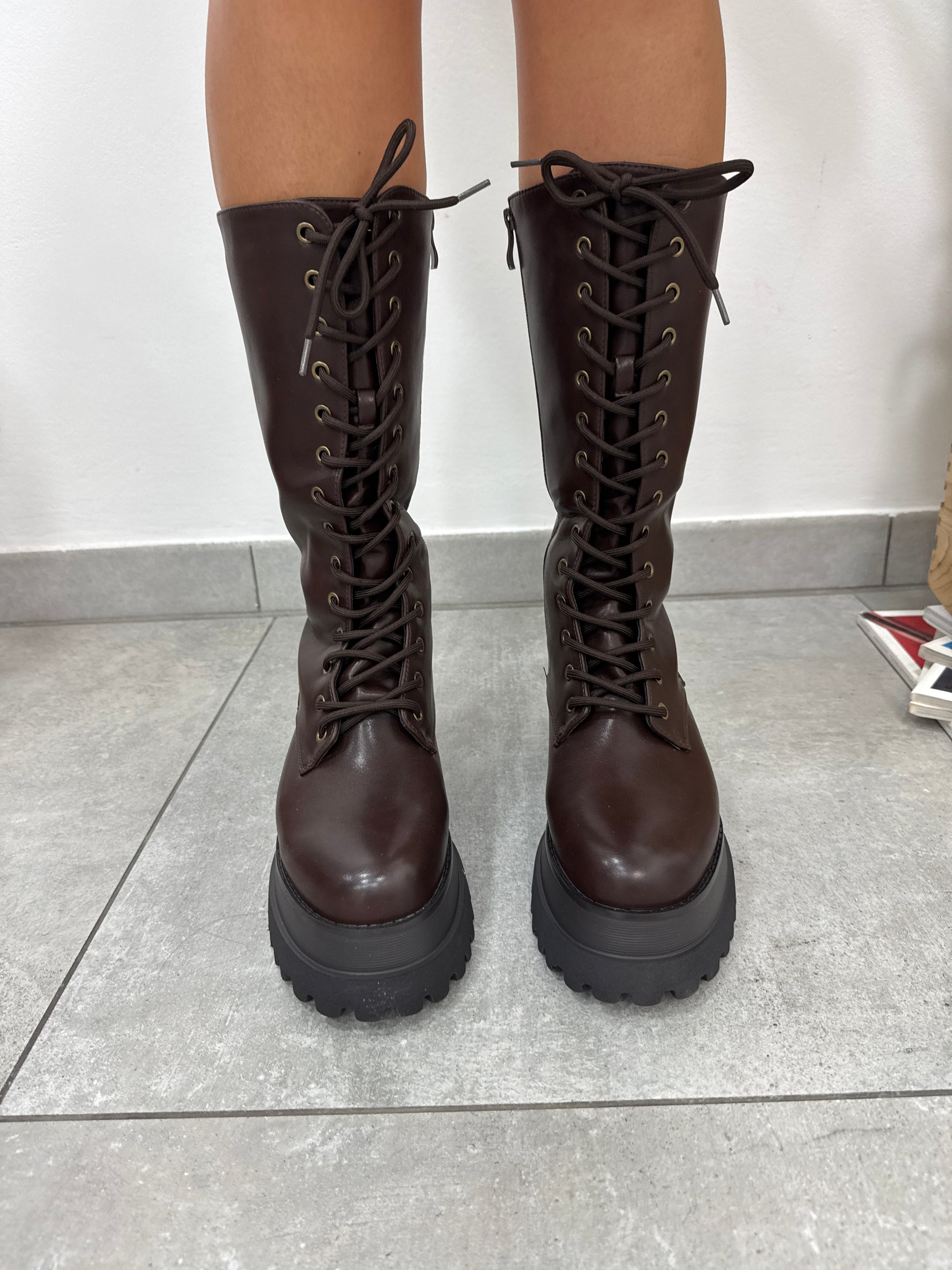 Stivali anfibi ecopelle con platform, lampo laterale e lacci regolabili.