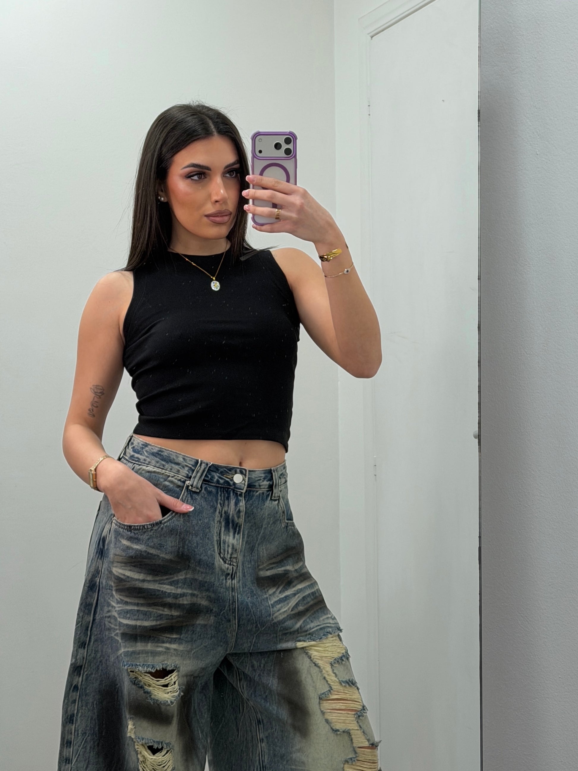 Canotta crop a costine girocollo.