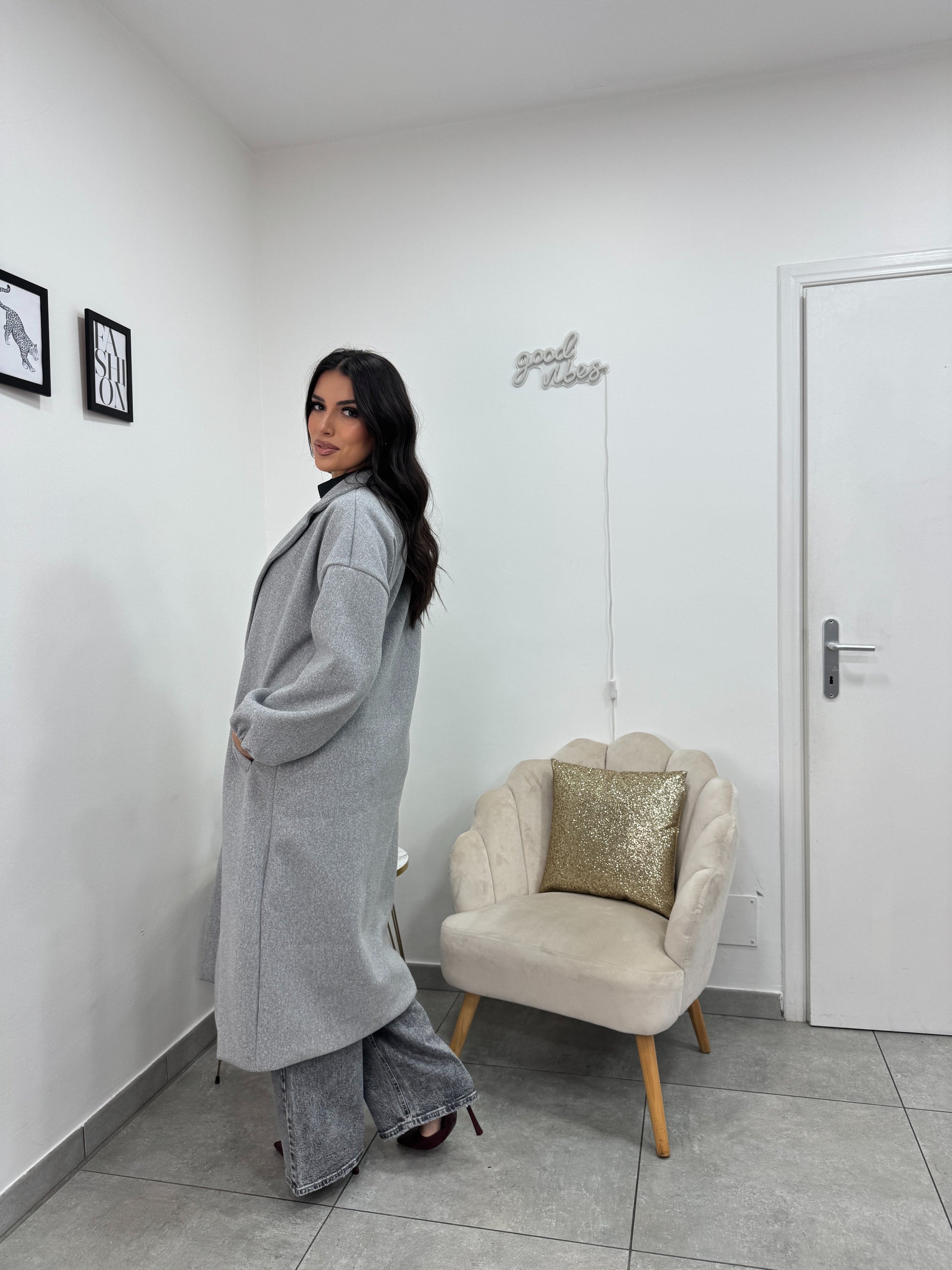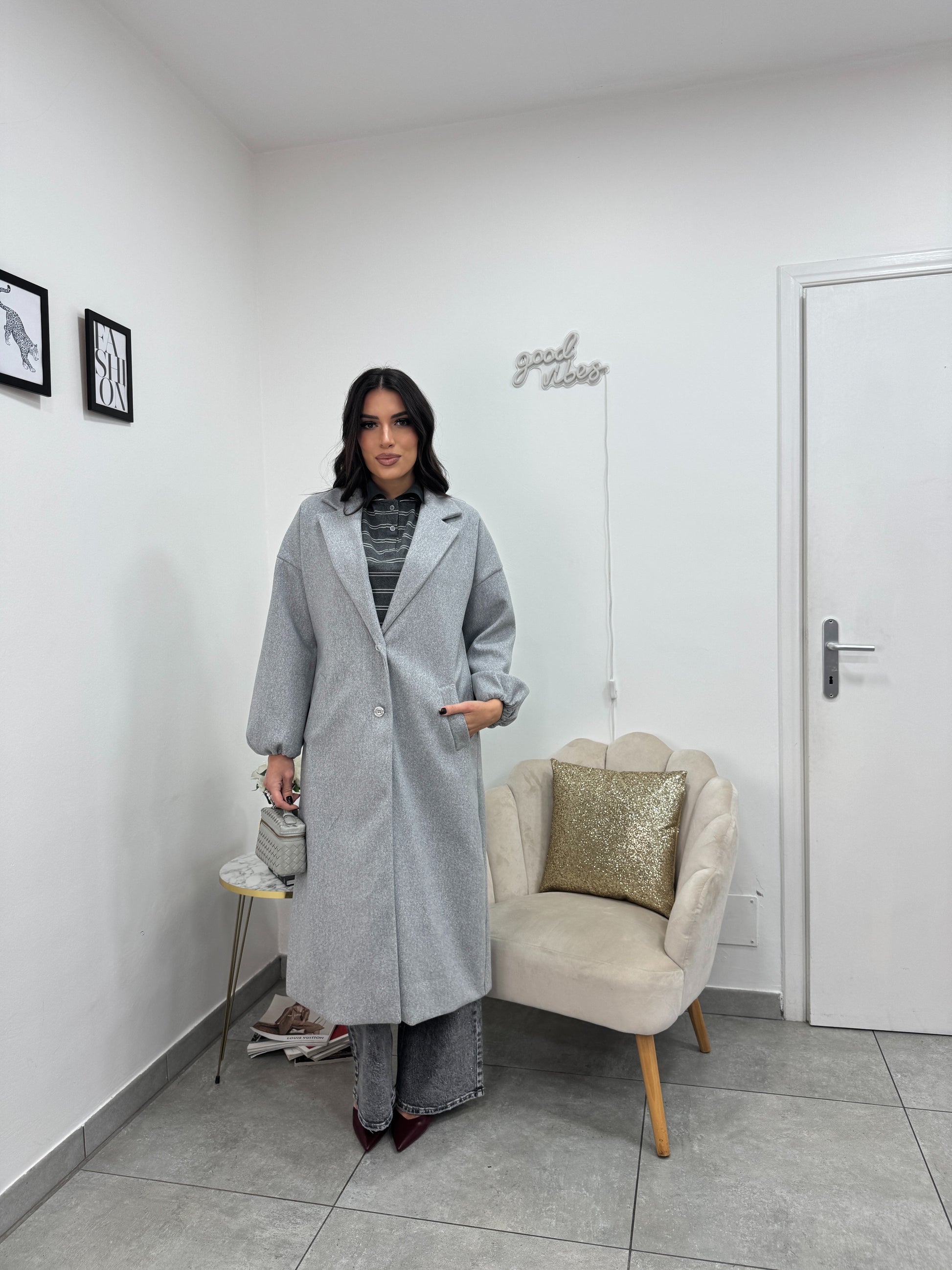 Cappotto lungo monopetto, foderato internamente. Tasche laterali, doppio bottone. Maniche con elastico.