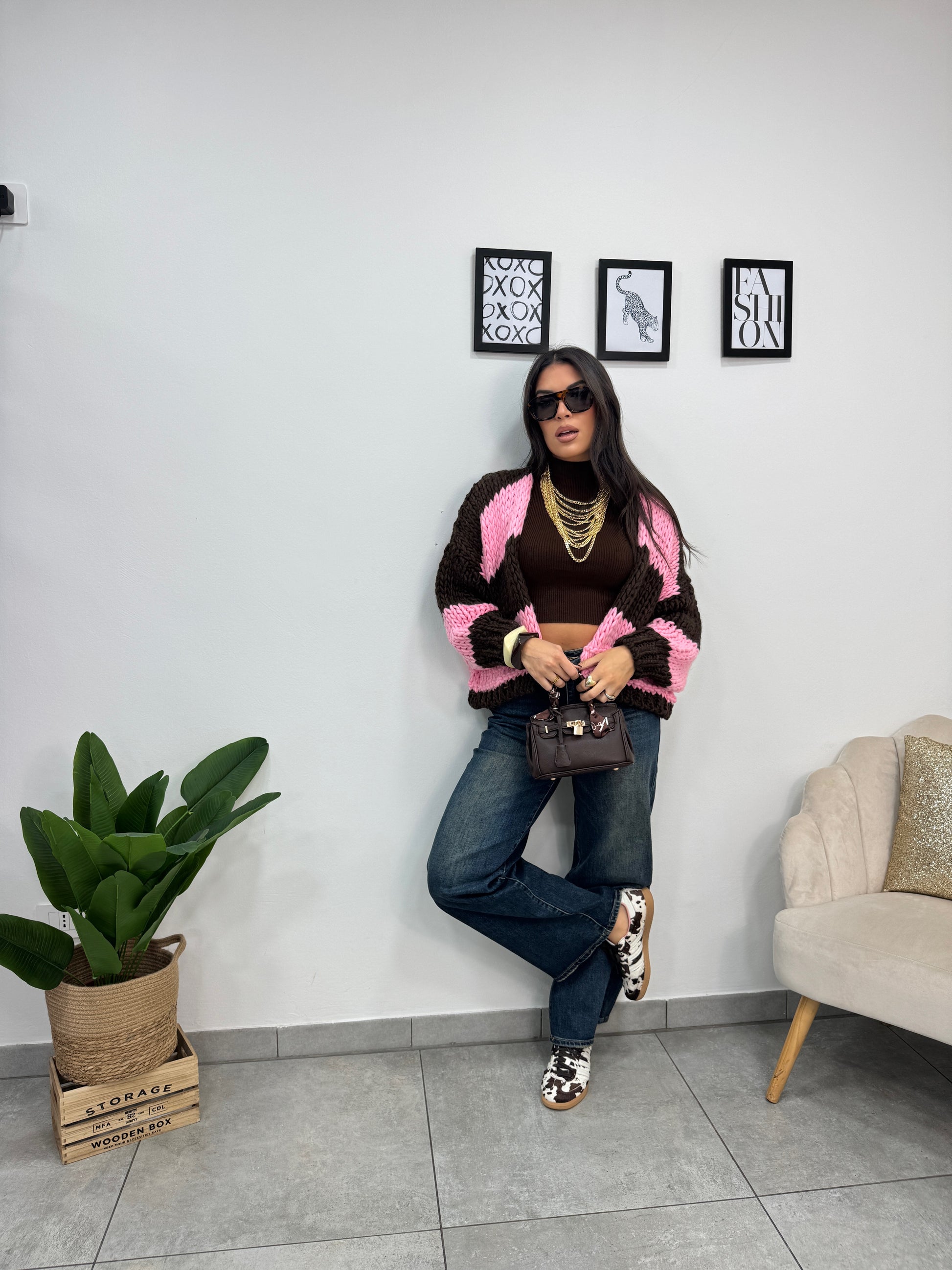 Cardigan a righe marrone, intrecciato. Senza chiusura.