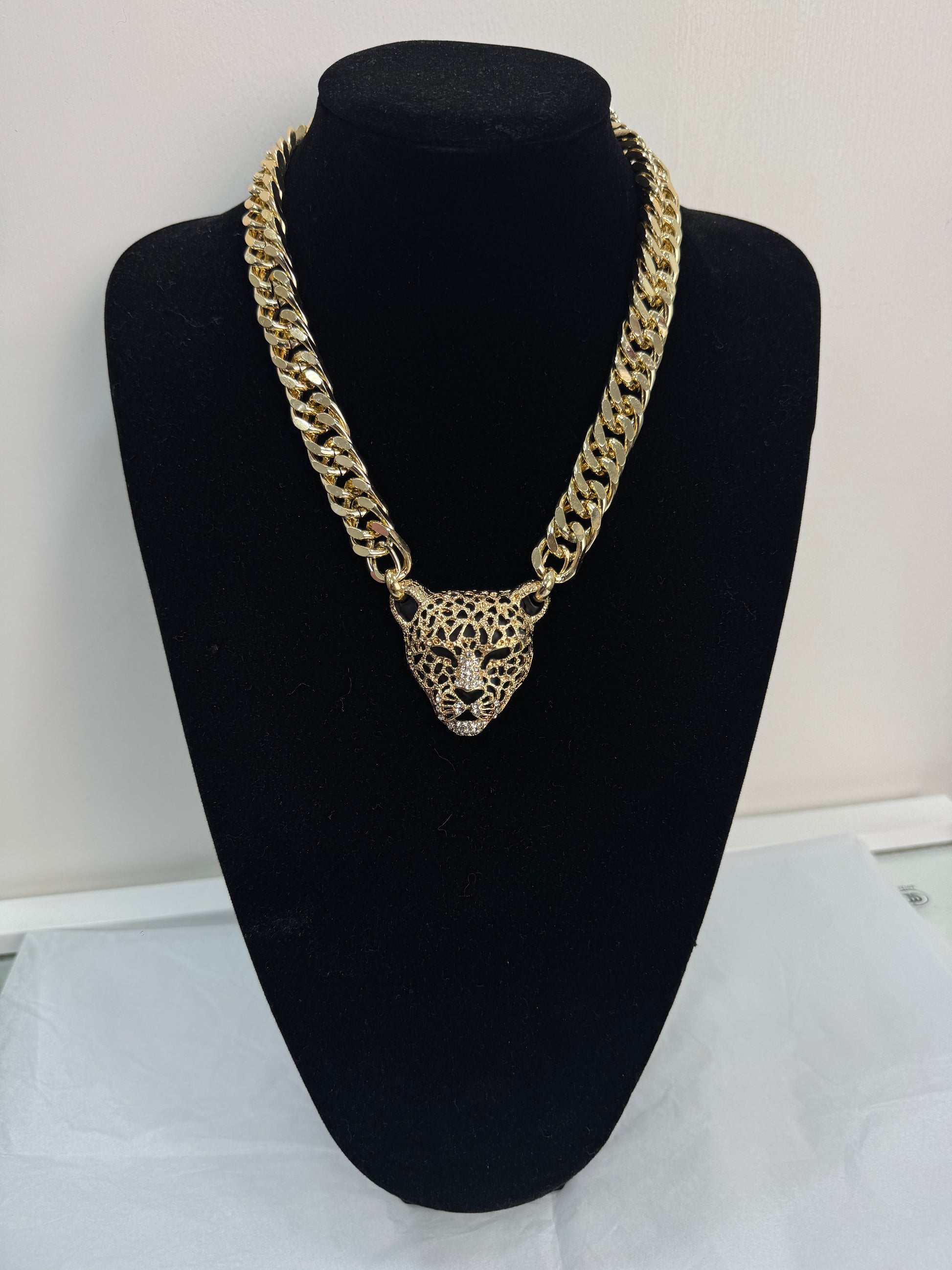 Collana con catena oro e ciondolo di tigre con dettagli strass.
