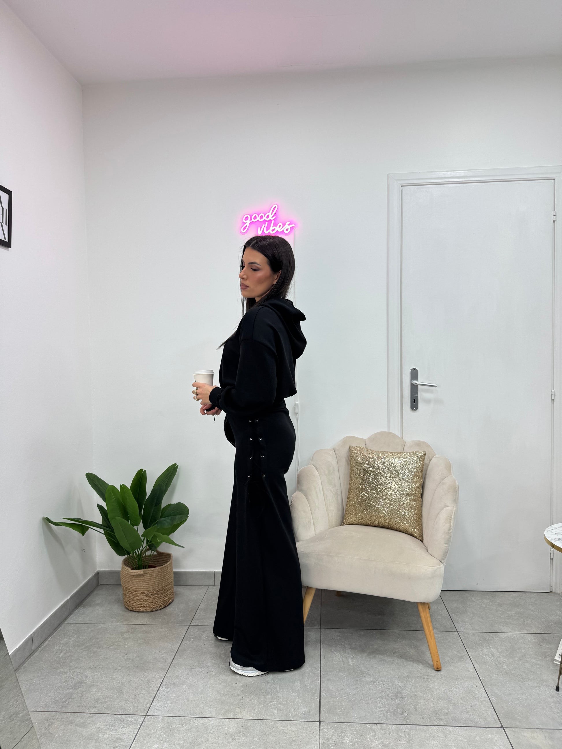 Coordinato con felpa con zip e cappuccio e pantalone palazzo con stringhe laterali.