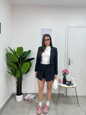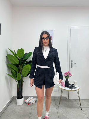 Coordinato gessato composto da giacca crop Monopetto, foderata con spalline preformate e pantagonna con bottoncini e elastico in vita.