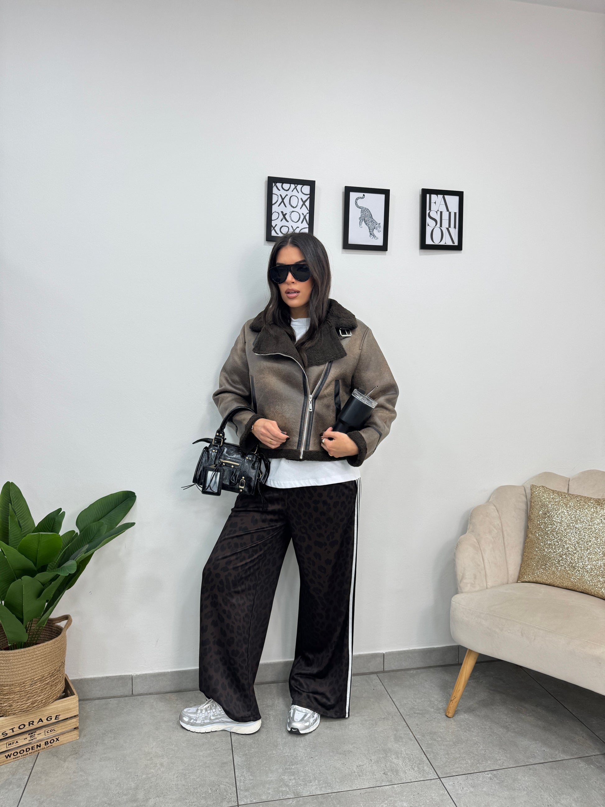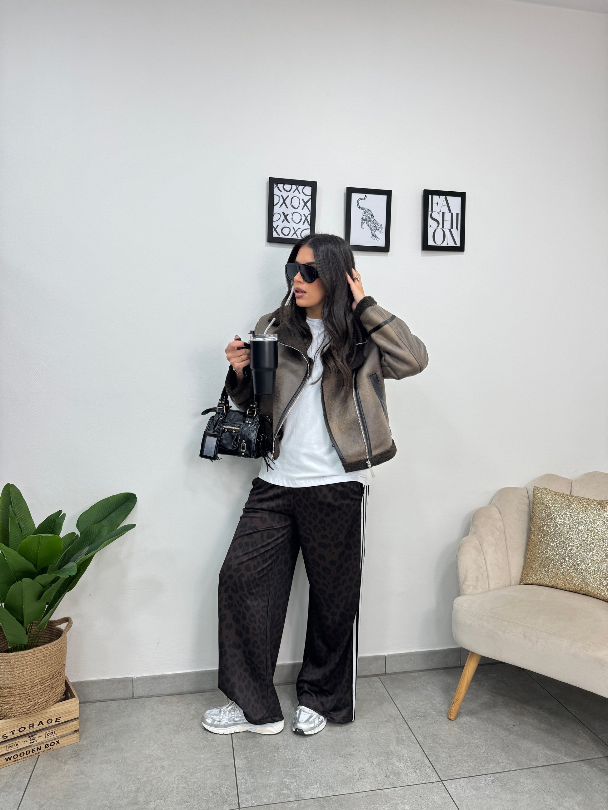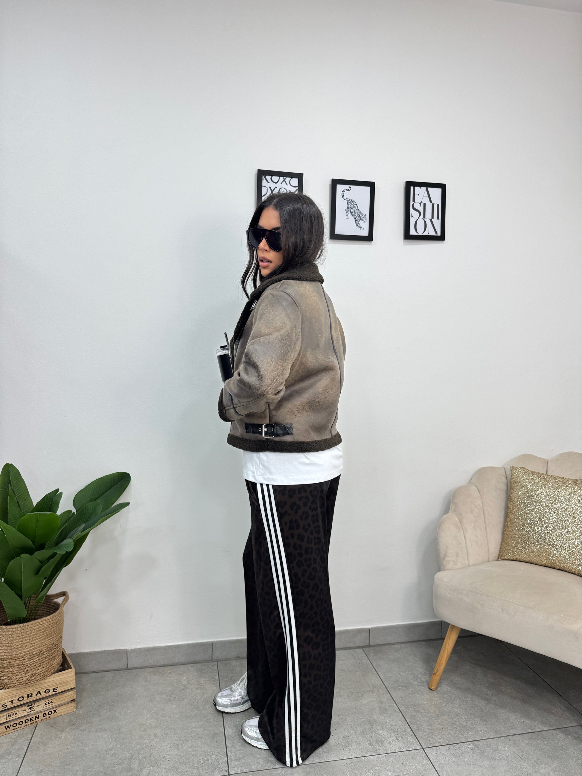 Ecomontone effetto vintage con dettagli in ecopelle, chiusura lampo obliqua, imbottito internamente.