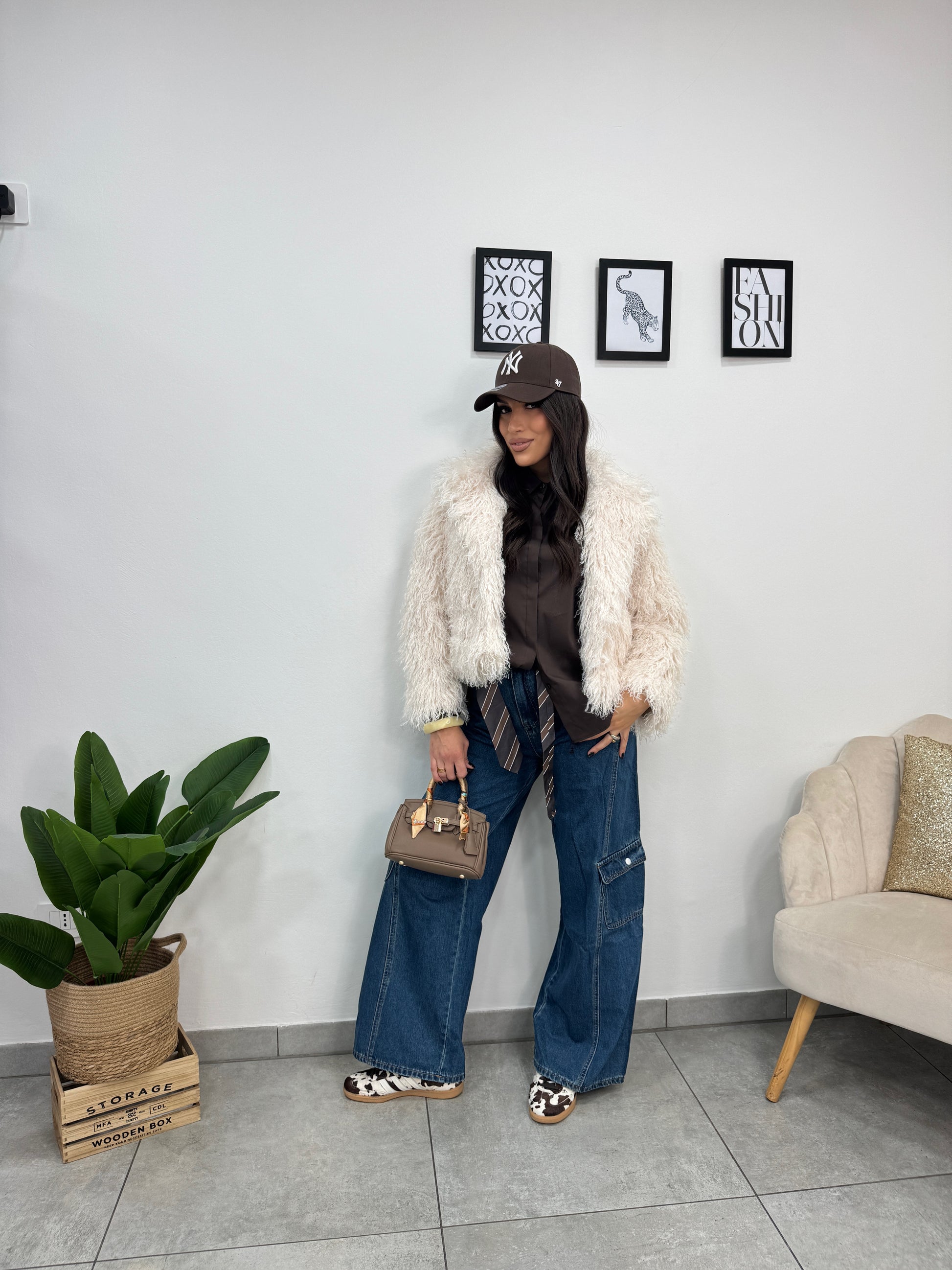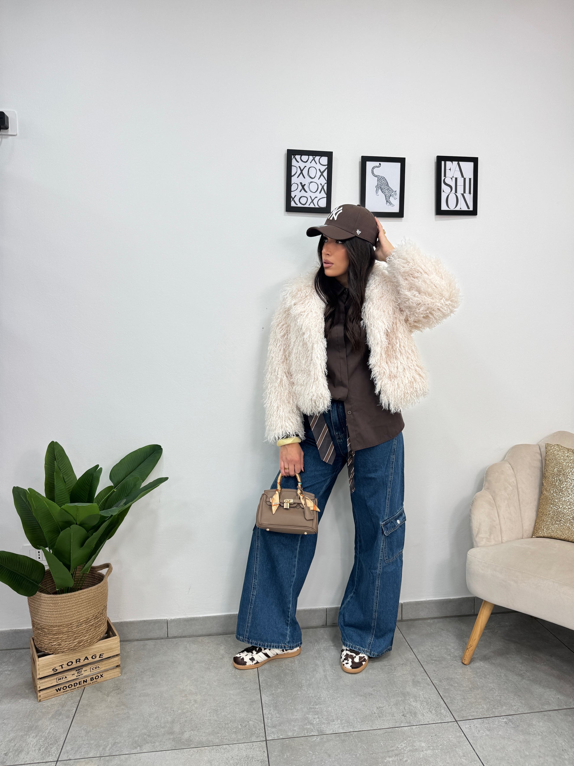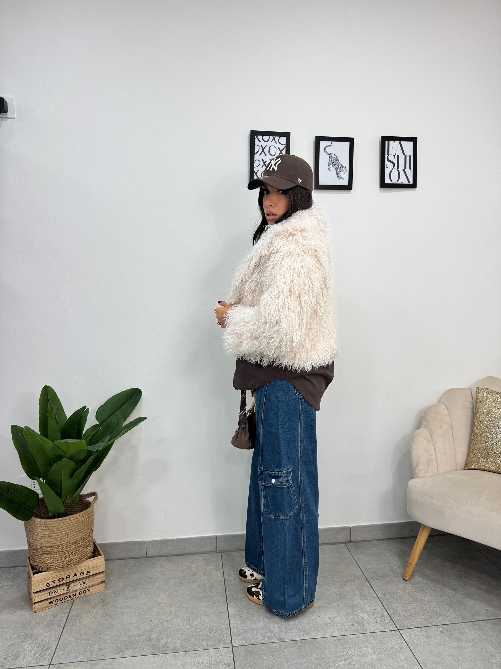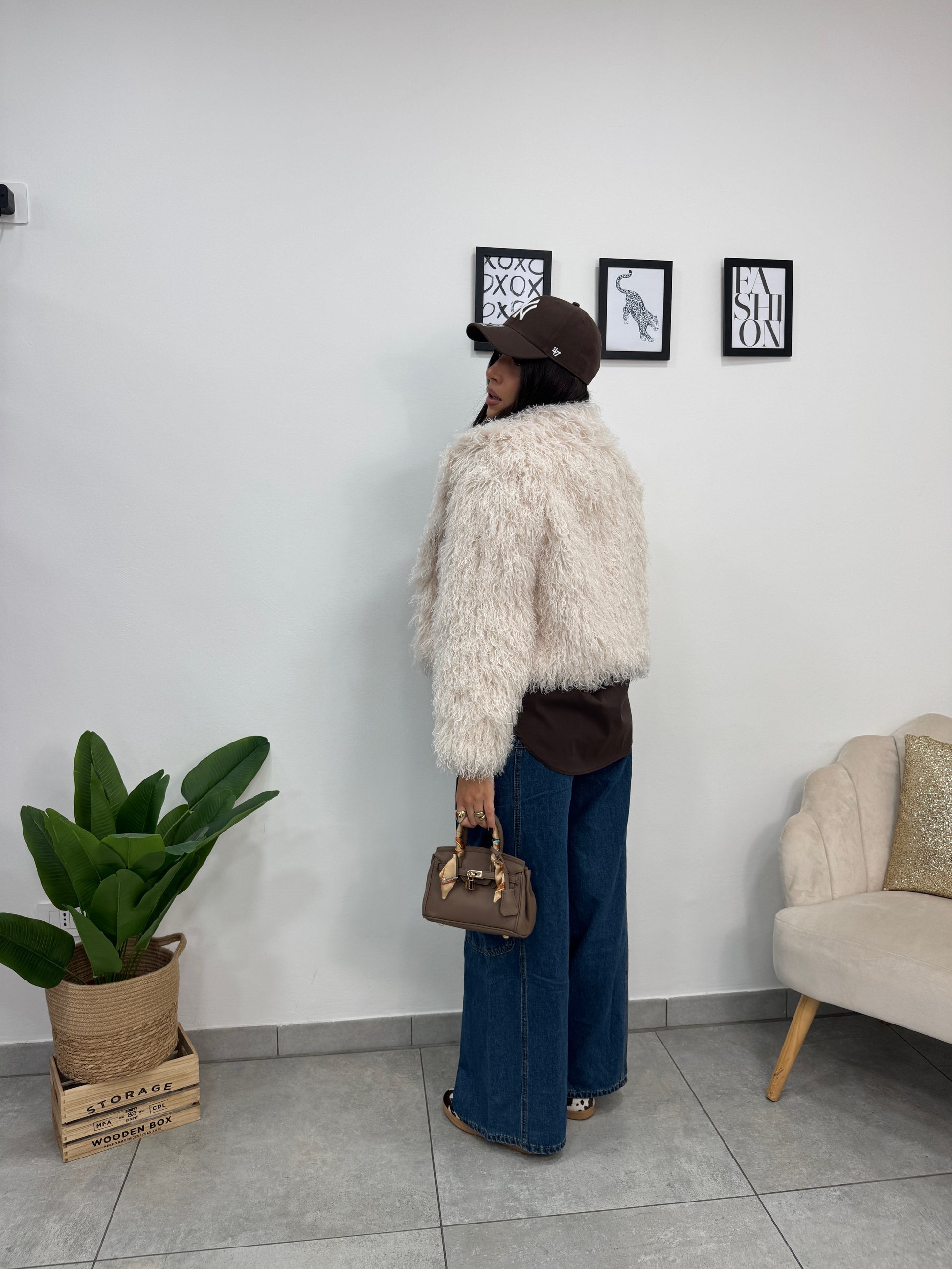 Ecopelliccia foderata internamente con pelo riccio, chiusura gancio, con tasche.