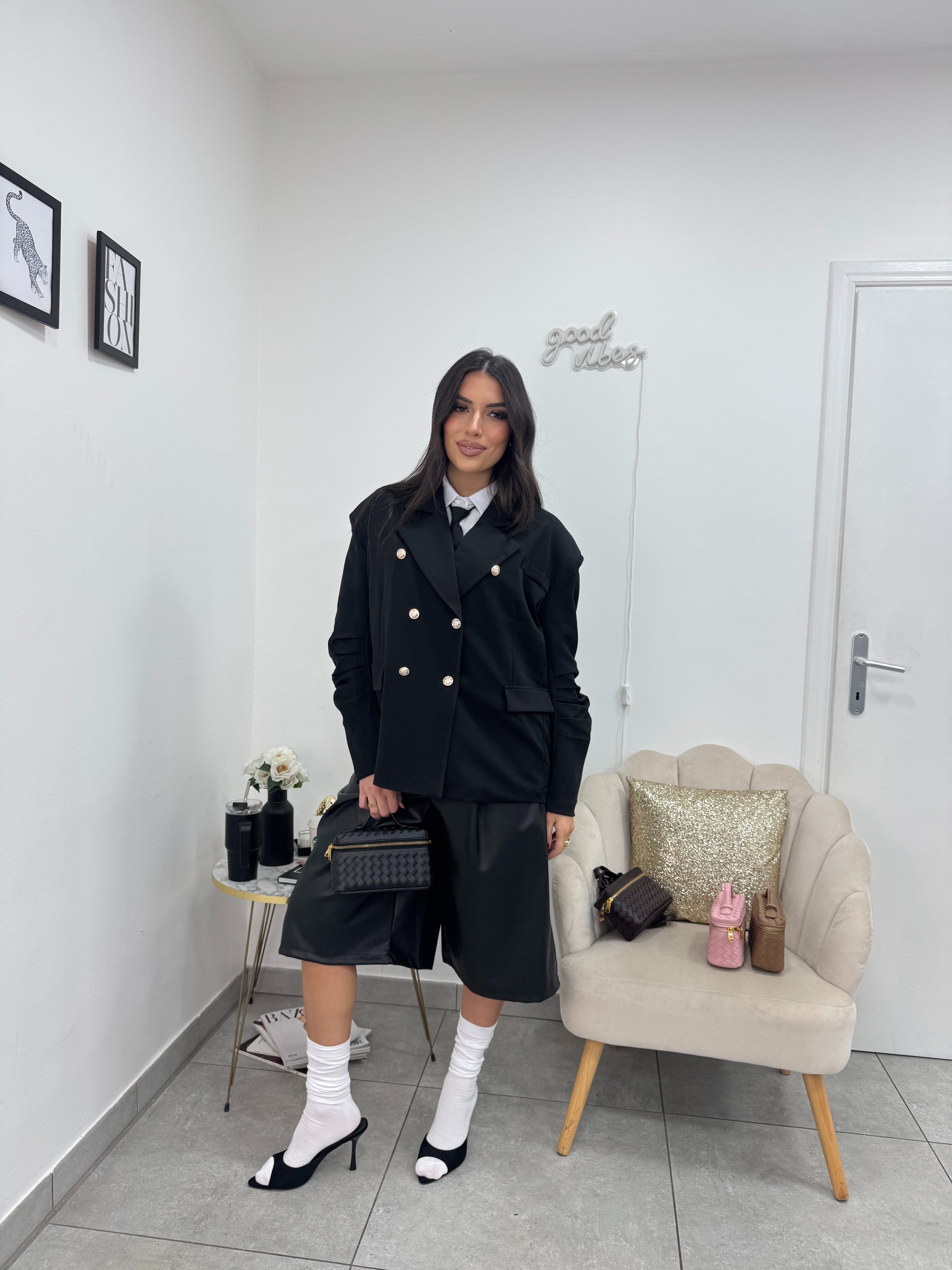 Giacca doppiopetto con bottoni oro e maniche arricciate.