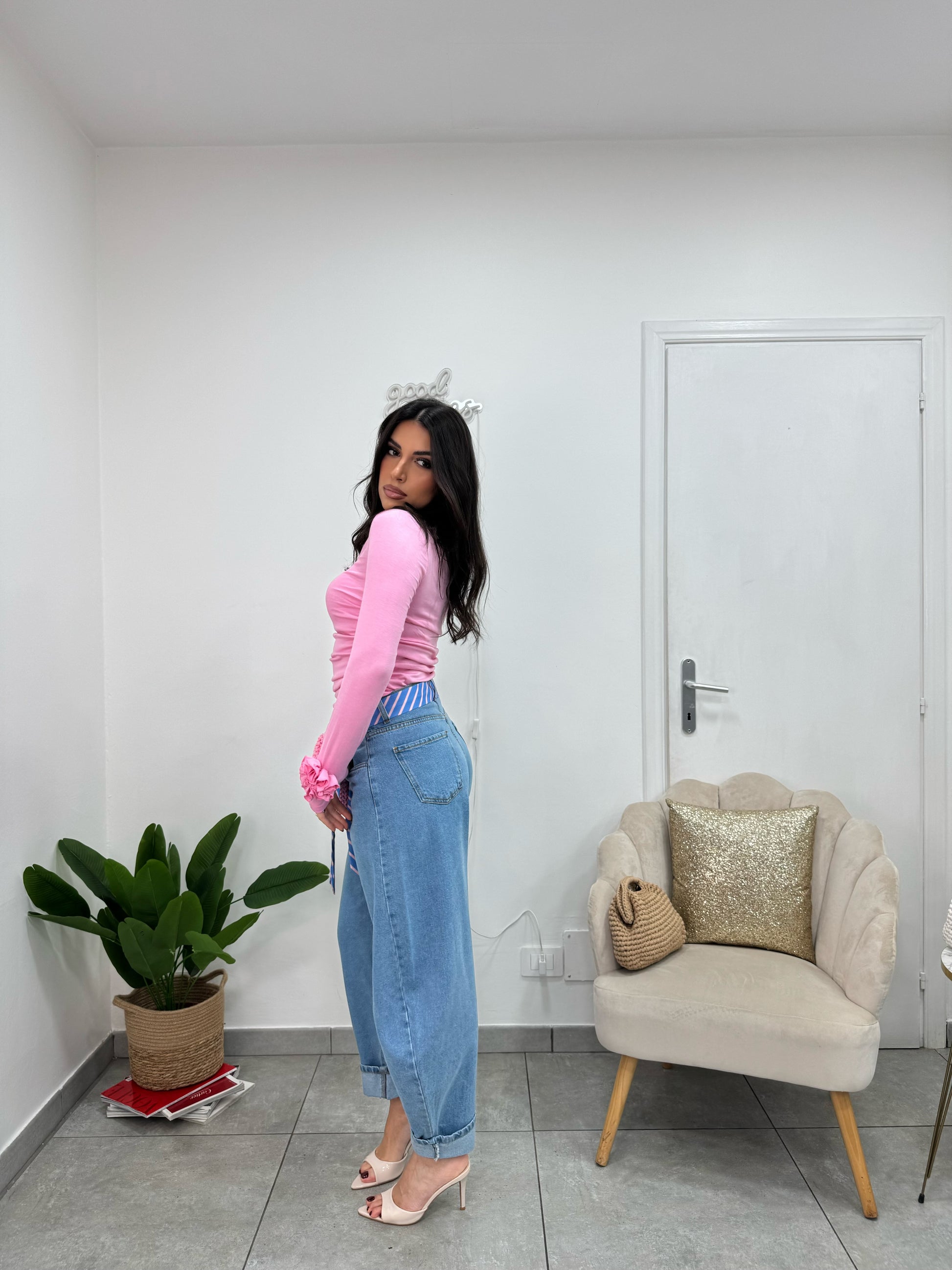 Jeans Balloon con risvolto cucito, cintura mood cravatta a righe.