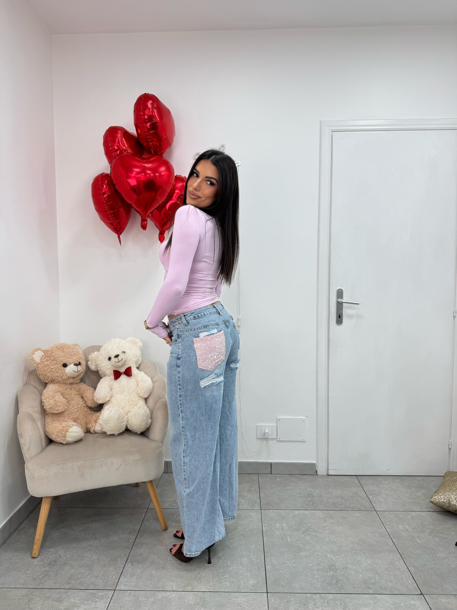 Jeans in denim Wideleg con dettagli in tessuto rosa, retro tasca rosa con strass e strappi foderati.