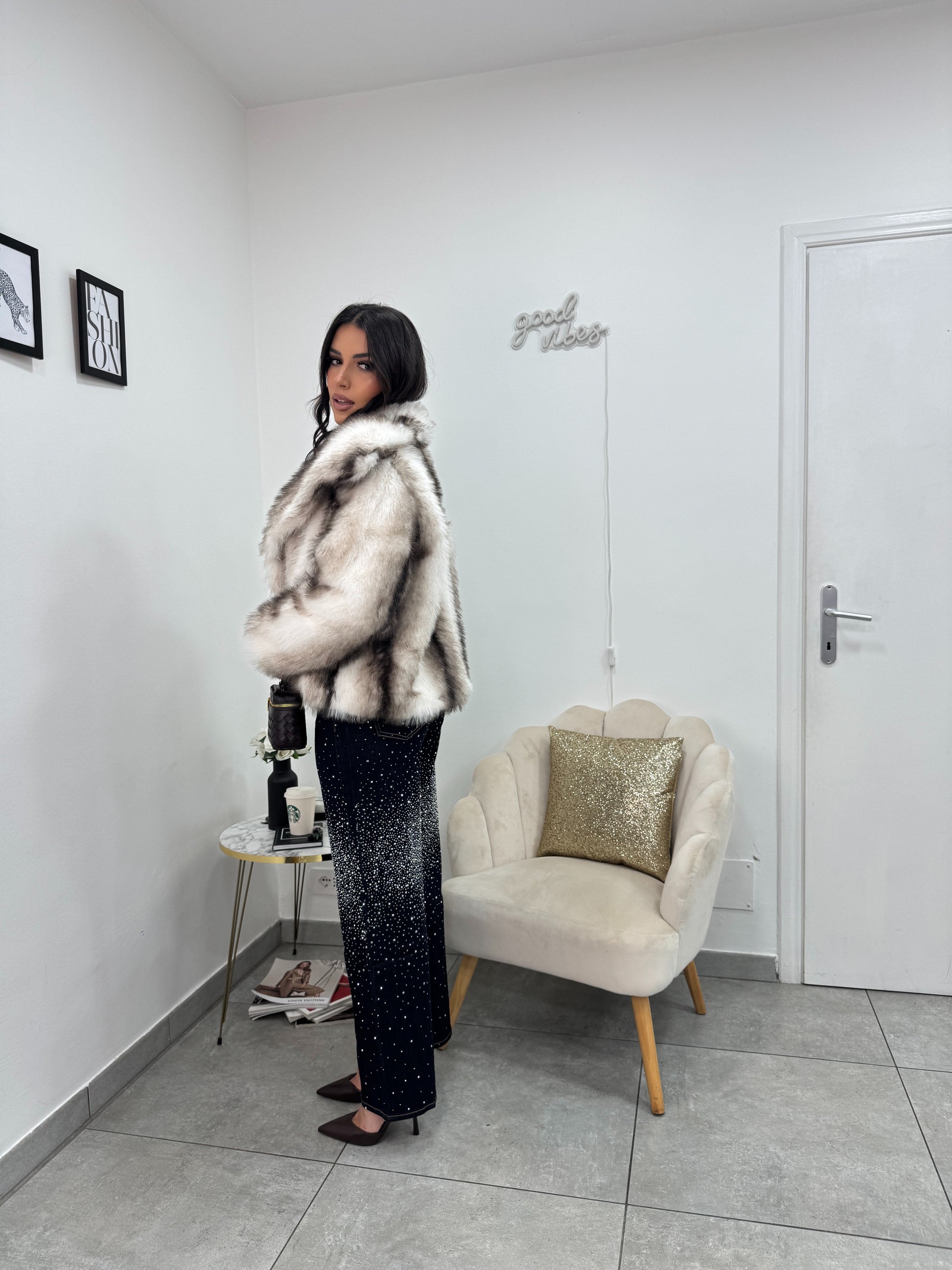 Jeans wideleg con chiusura obliqua con strass argento sfumati, elasticizzato.