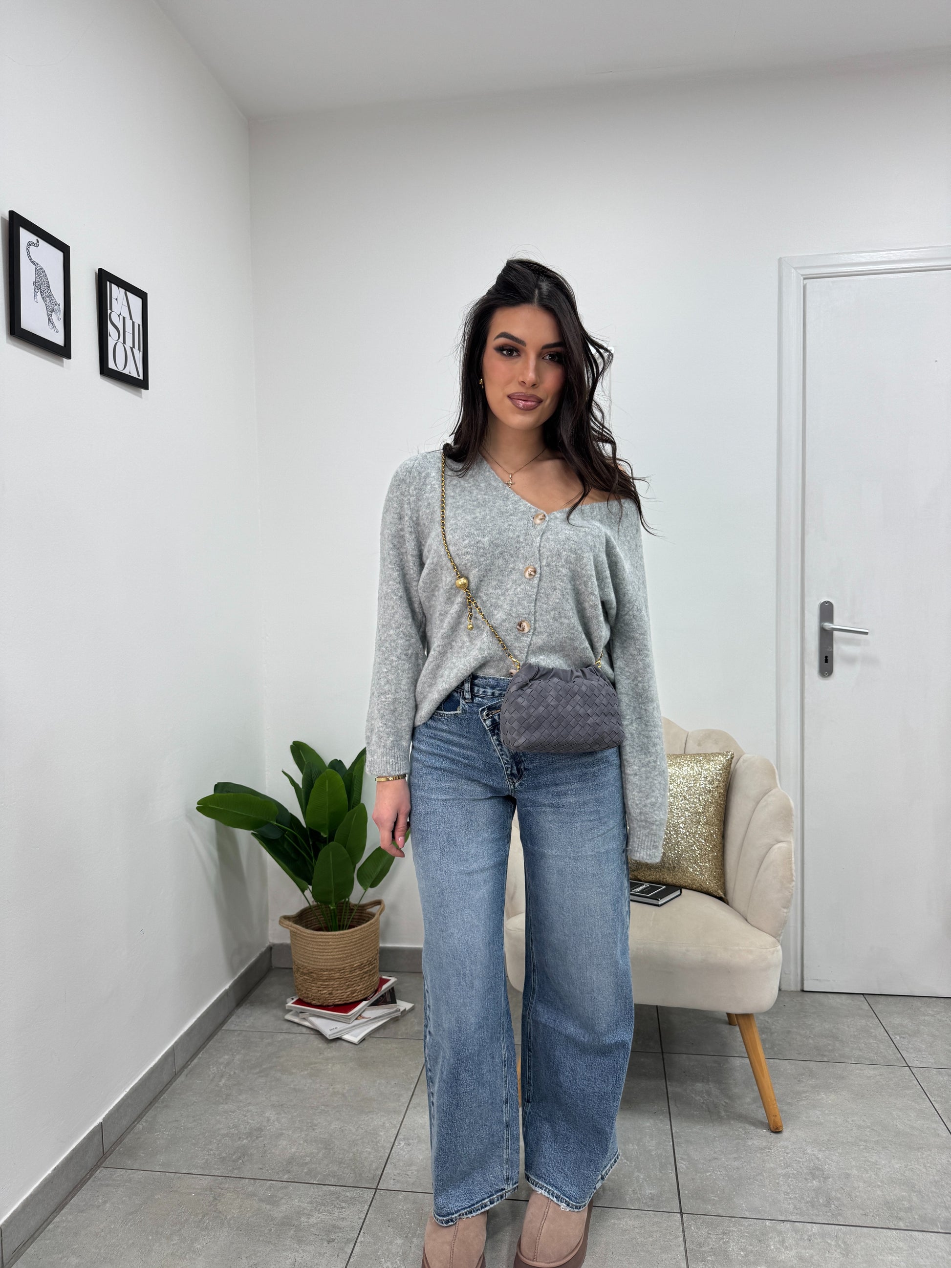 Jeans a palazzo con bottone obliquo in vita. Doppio bottone.