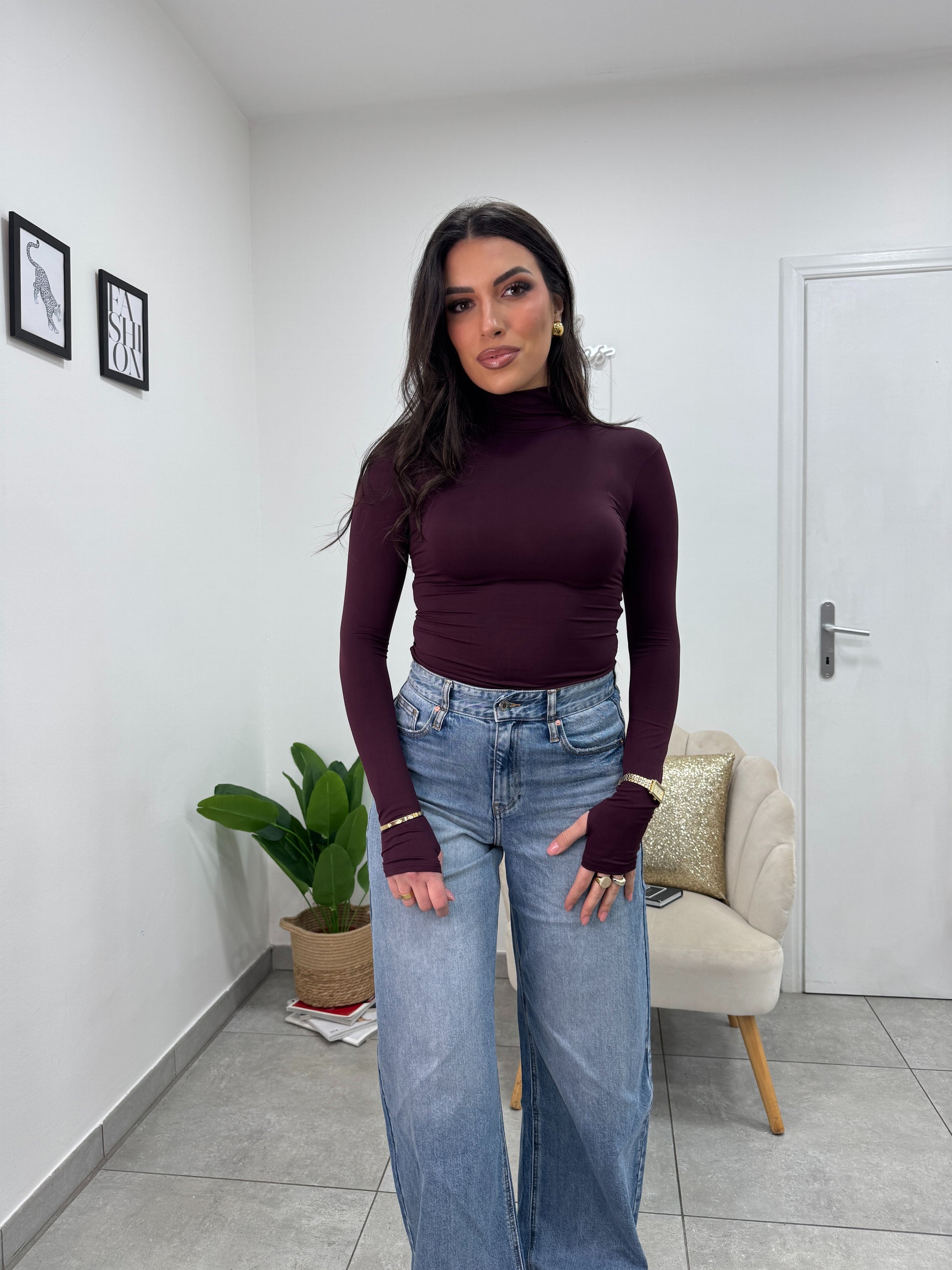 Maglia con manica lunga a guanto, tinta unita con collo alto morbido.