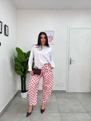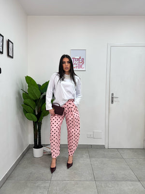 Pantalone modello balloon con elastico in vita, passanti, zip e bottone.