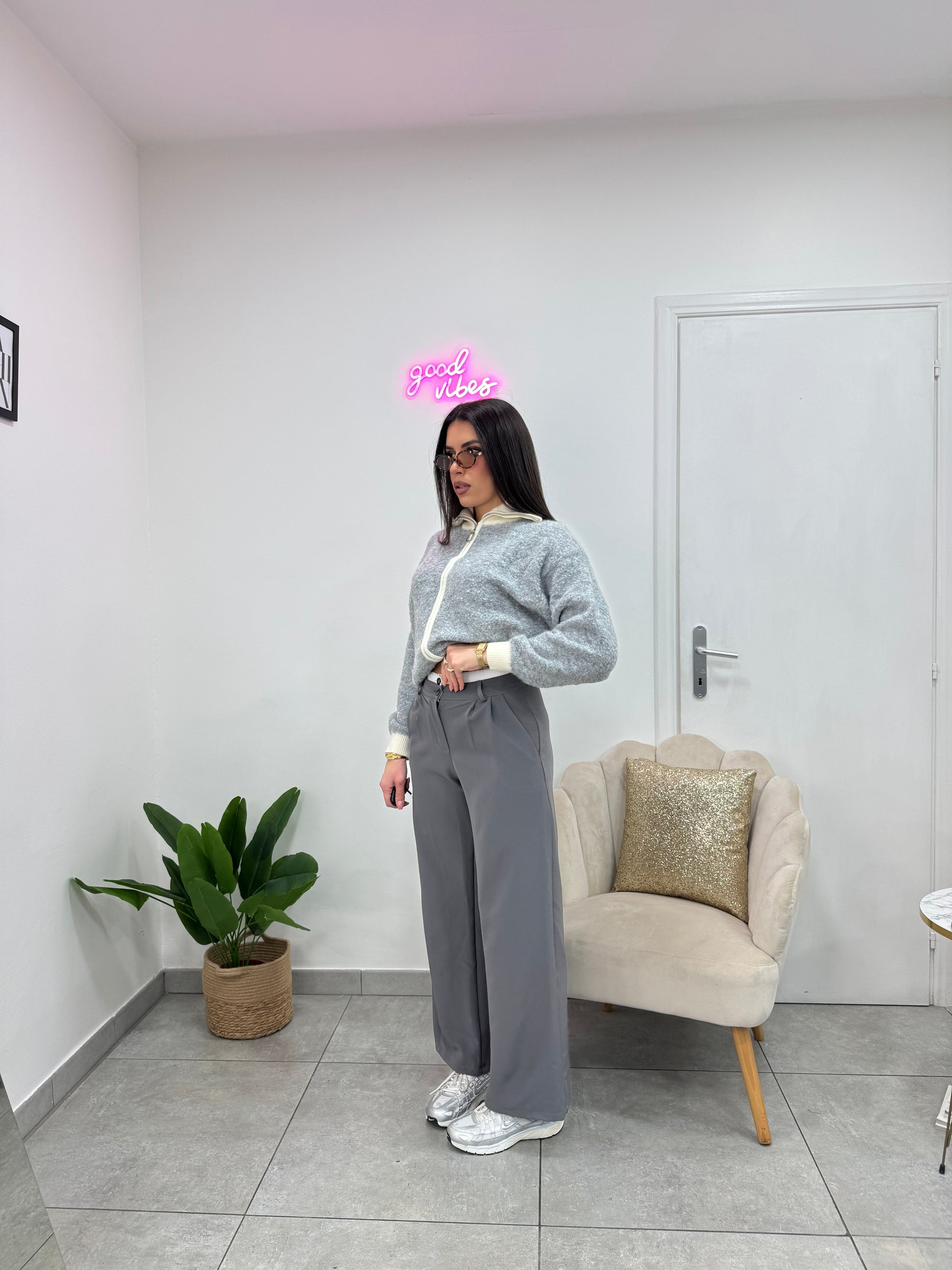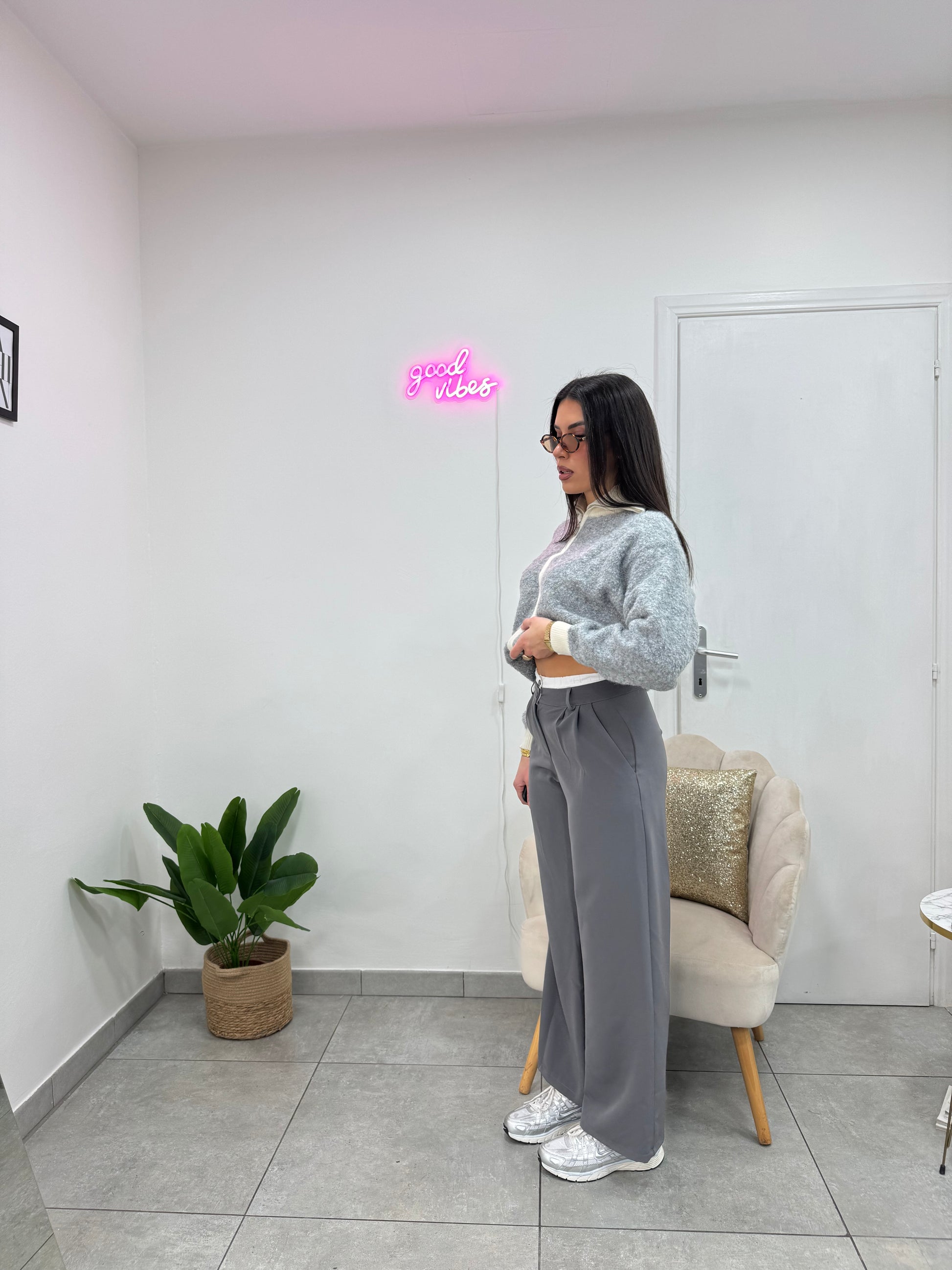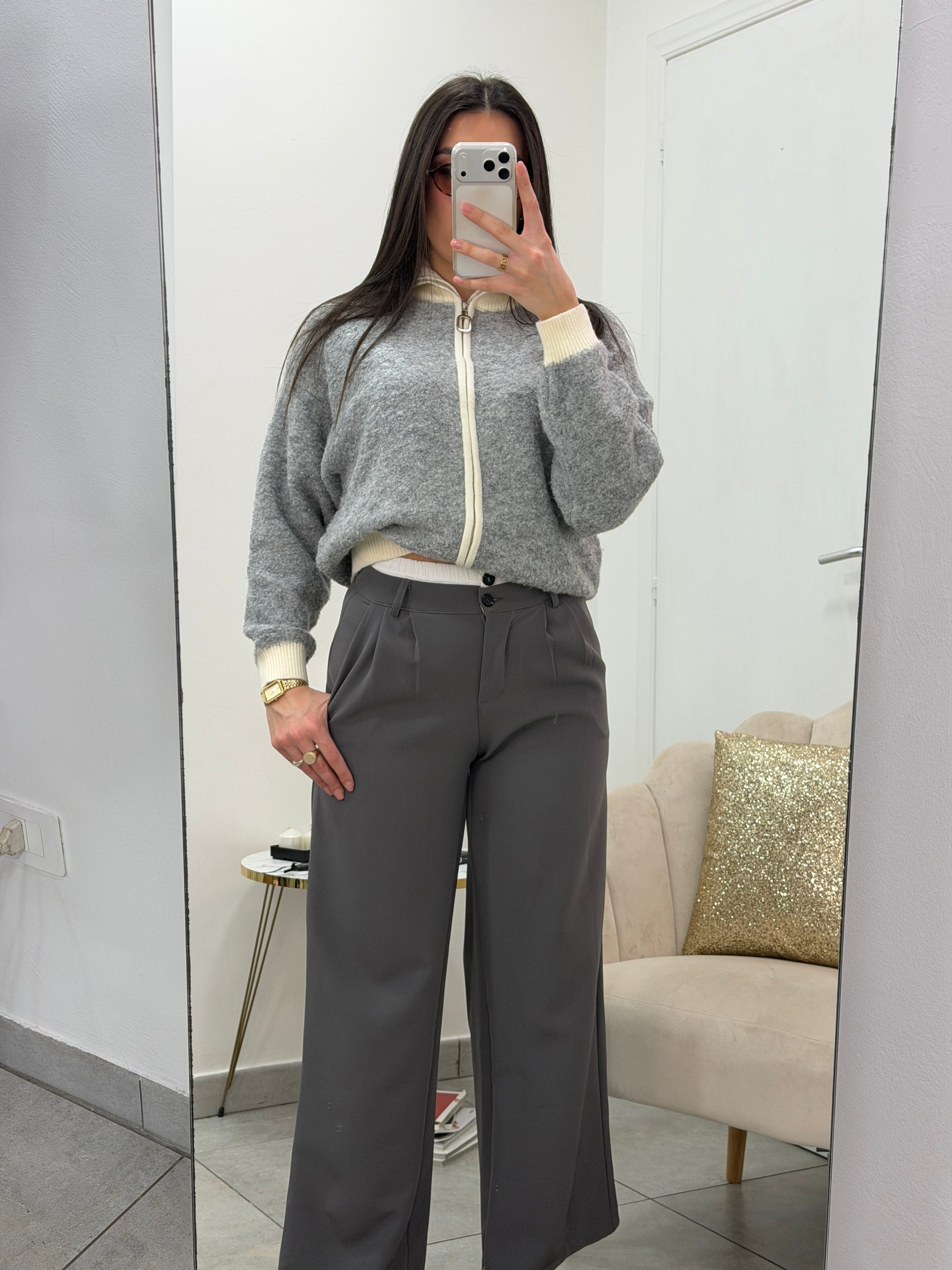 Pantaloni a palazzo con doppio bottone, zip ed elastico bianco che esce fuori.