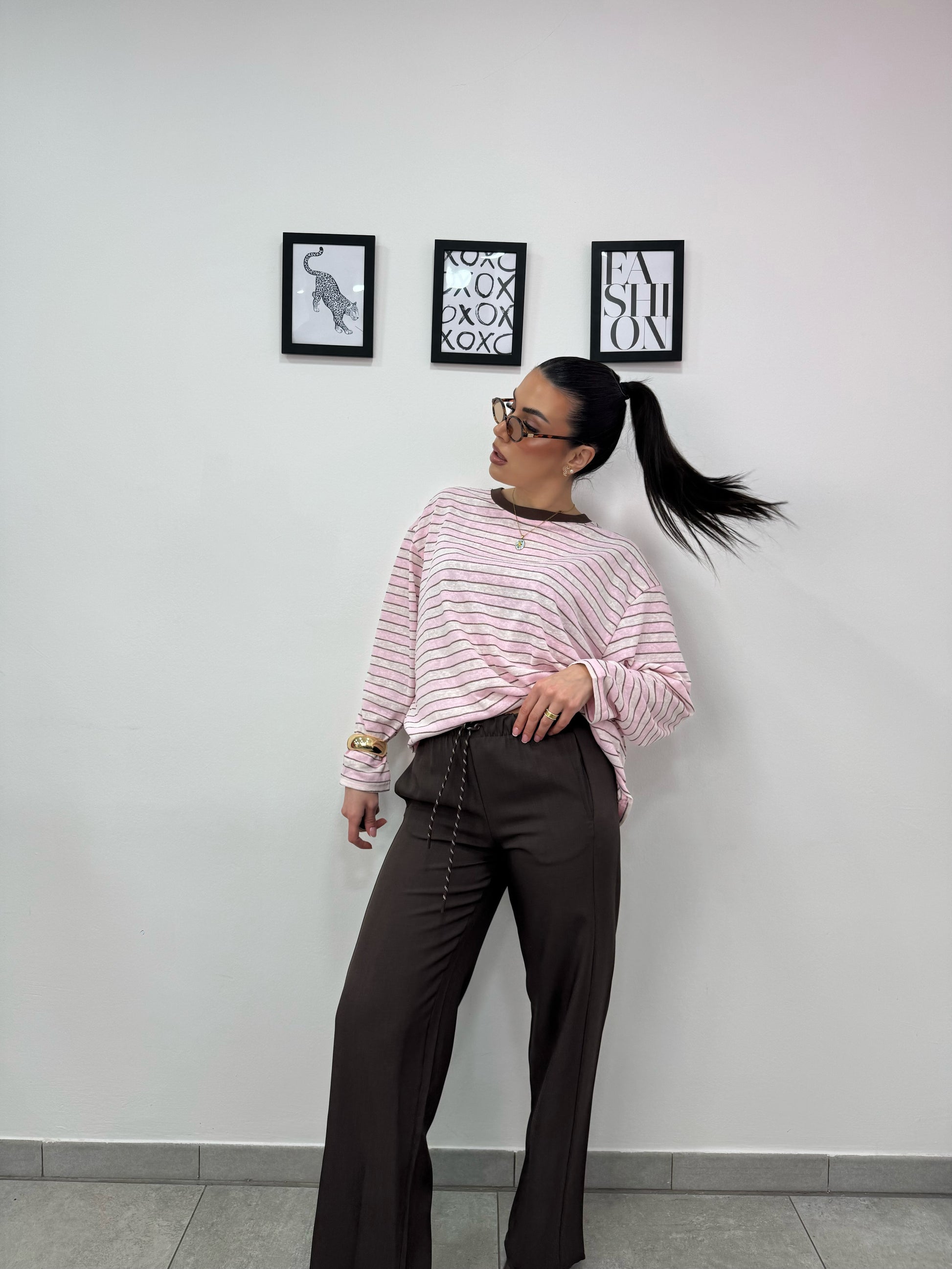 Pantalone palazzo con coulisse, laccio mood corda, elastico in vita. Tasche sul retro.