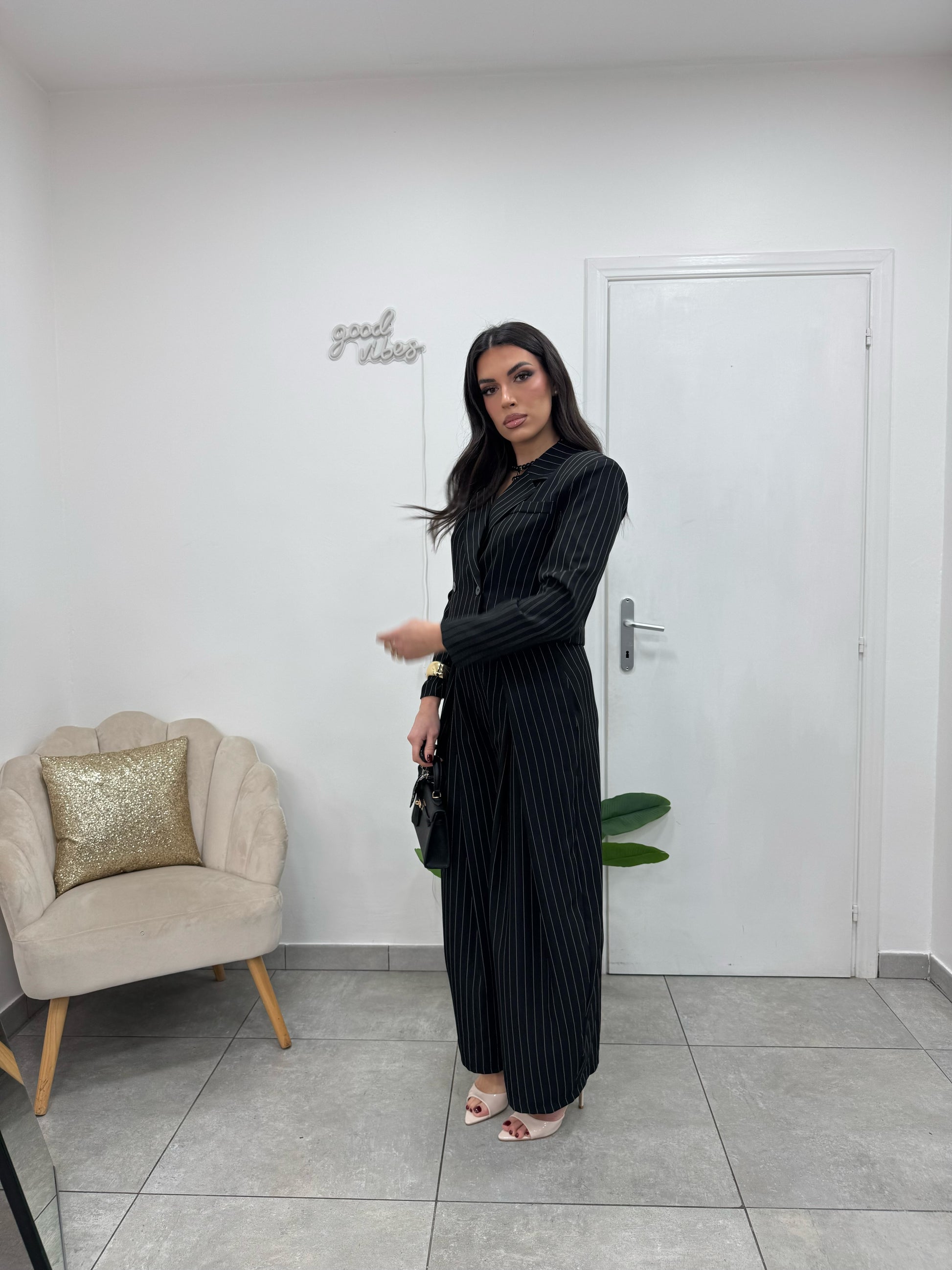 Pantalone gessato leggermente a palloncino con pences, elastico in vita, bottone e zip.