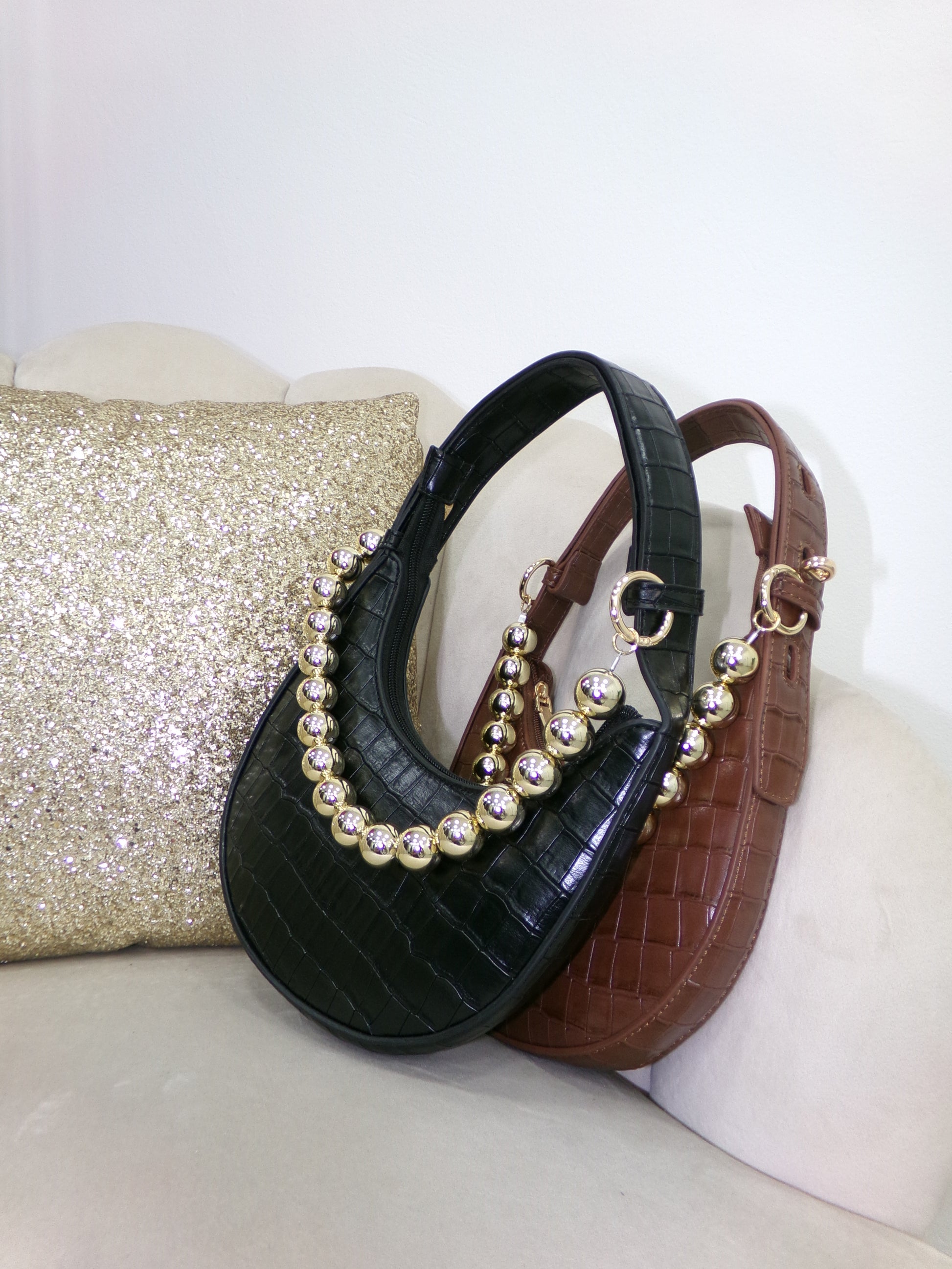 Pochette ecopelle effetto coccodrillo, forma stondata. Manico regolabile, charm oro rimovibile. Dotata di tracolla.