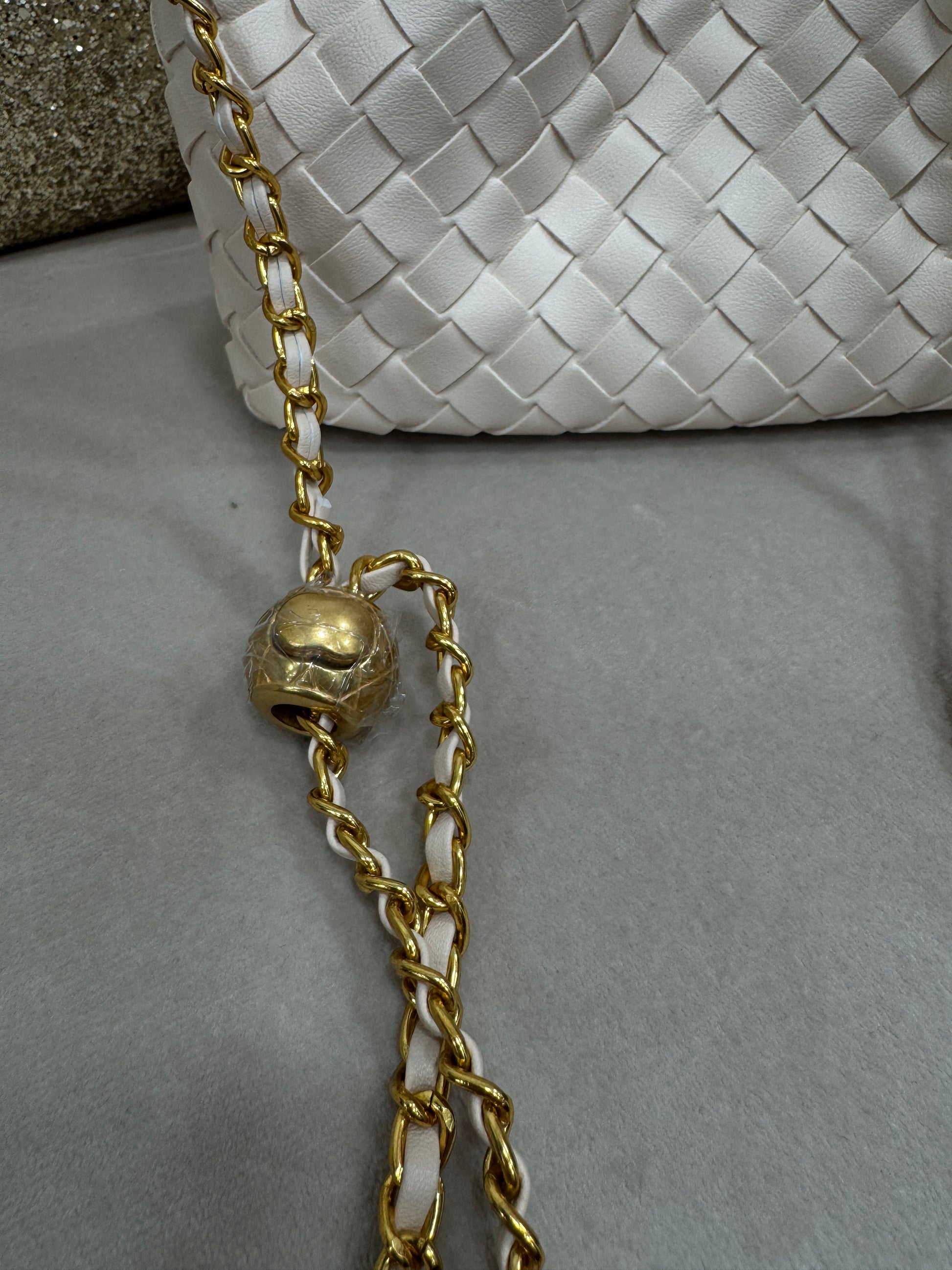 Pochette intrecciata in ecopelle con tracolla in oro rimovibile e regolabile e bottone per chiusura.