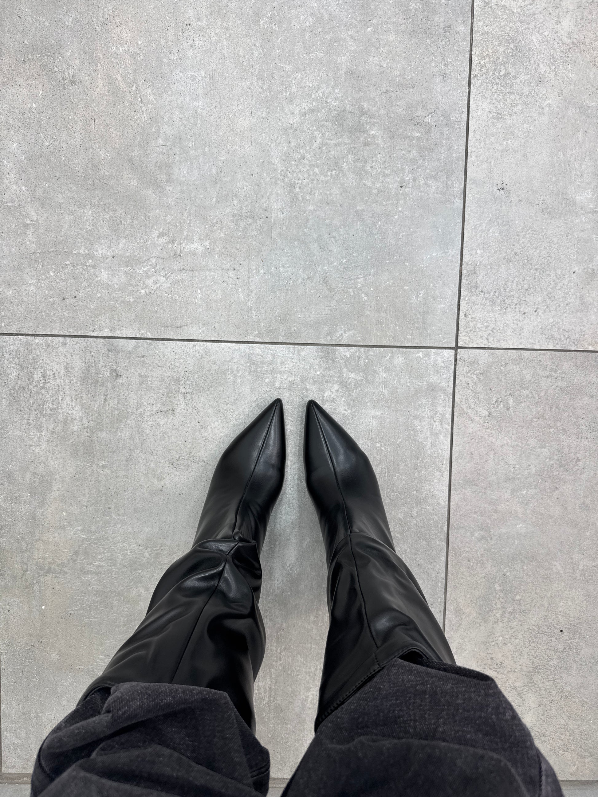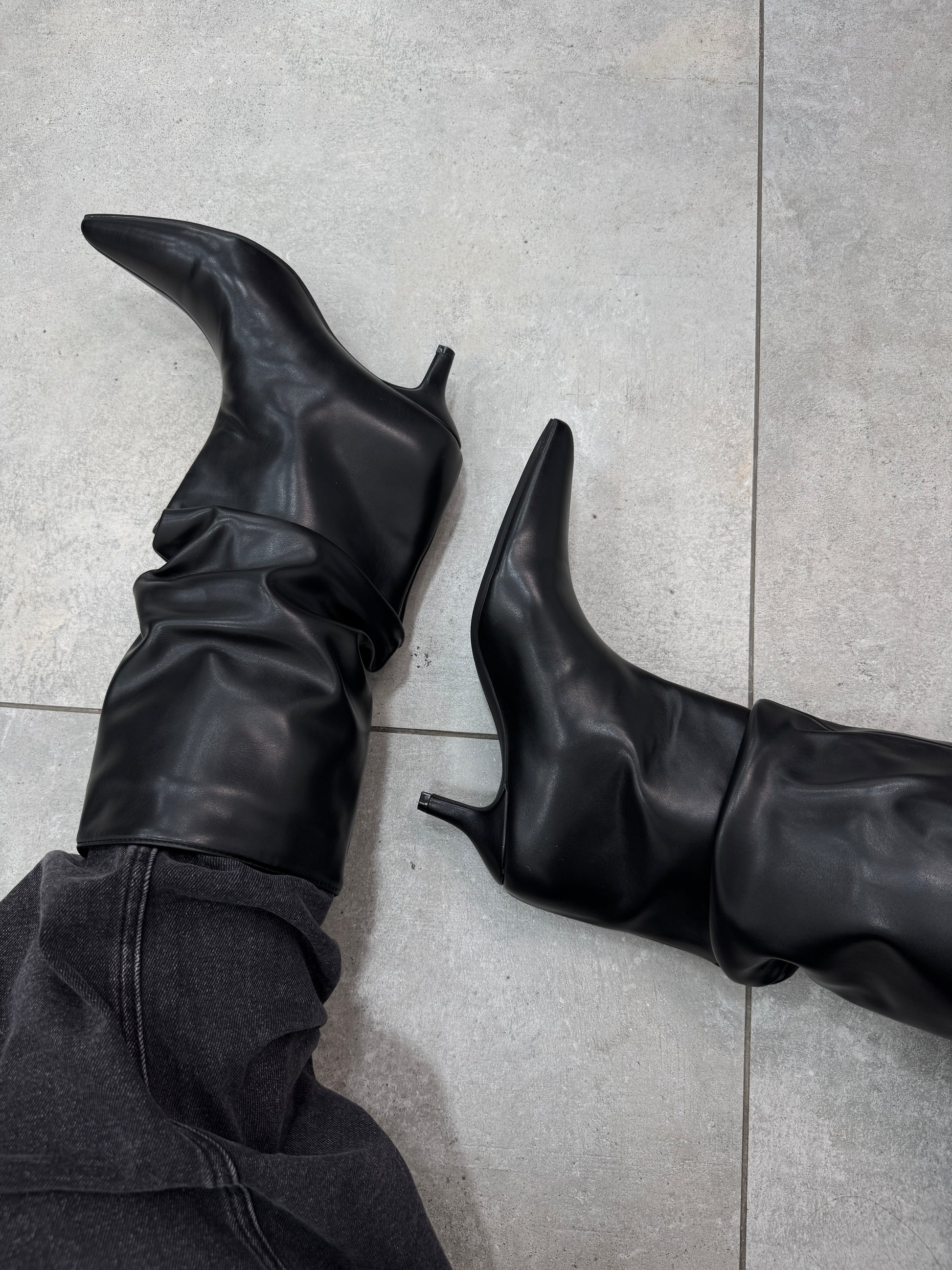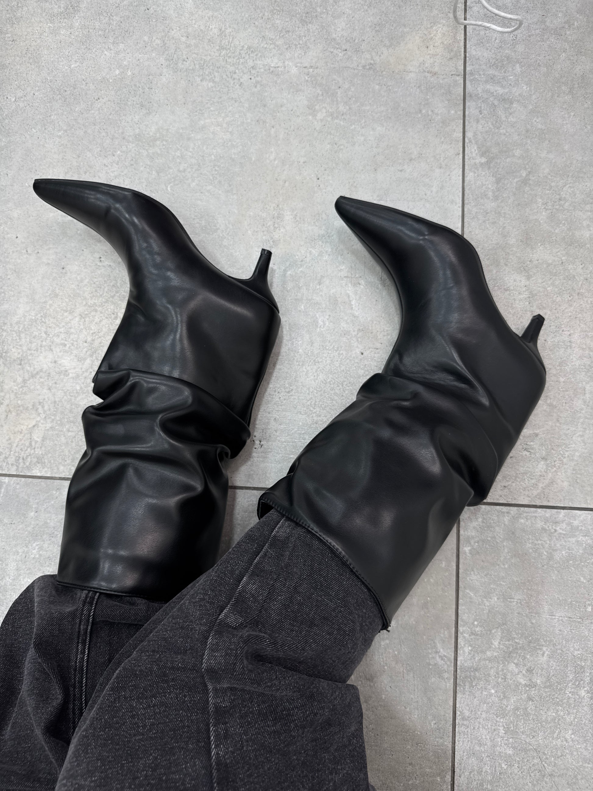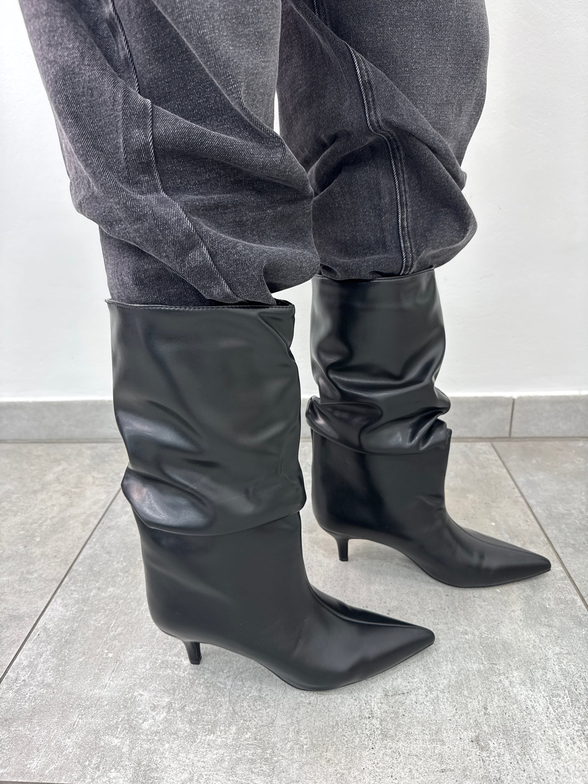 Stivaletti in media lunghezza con arricciatura e tacco di circa 3/4 cm.