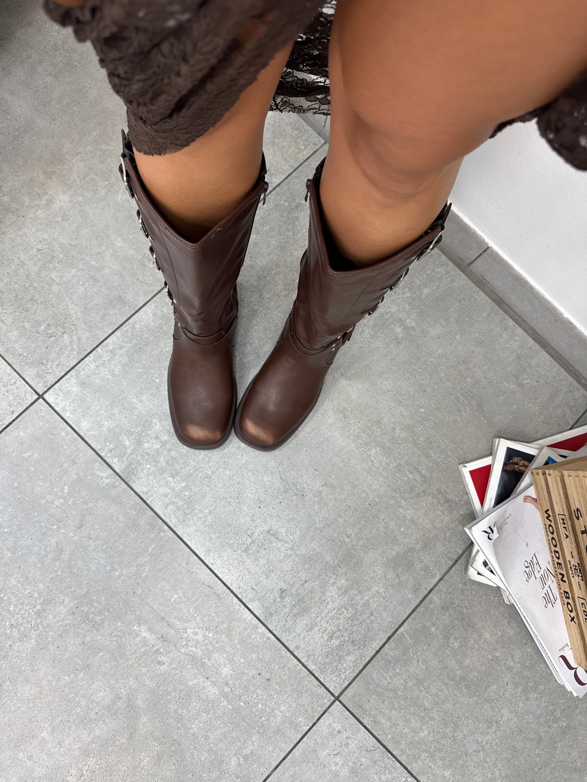 Stivali biker ecopelle con fibbie grigie, lampo laterale, punta squadrata. Tacco circa 4 cm.