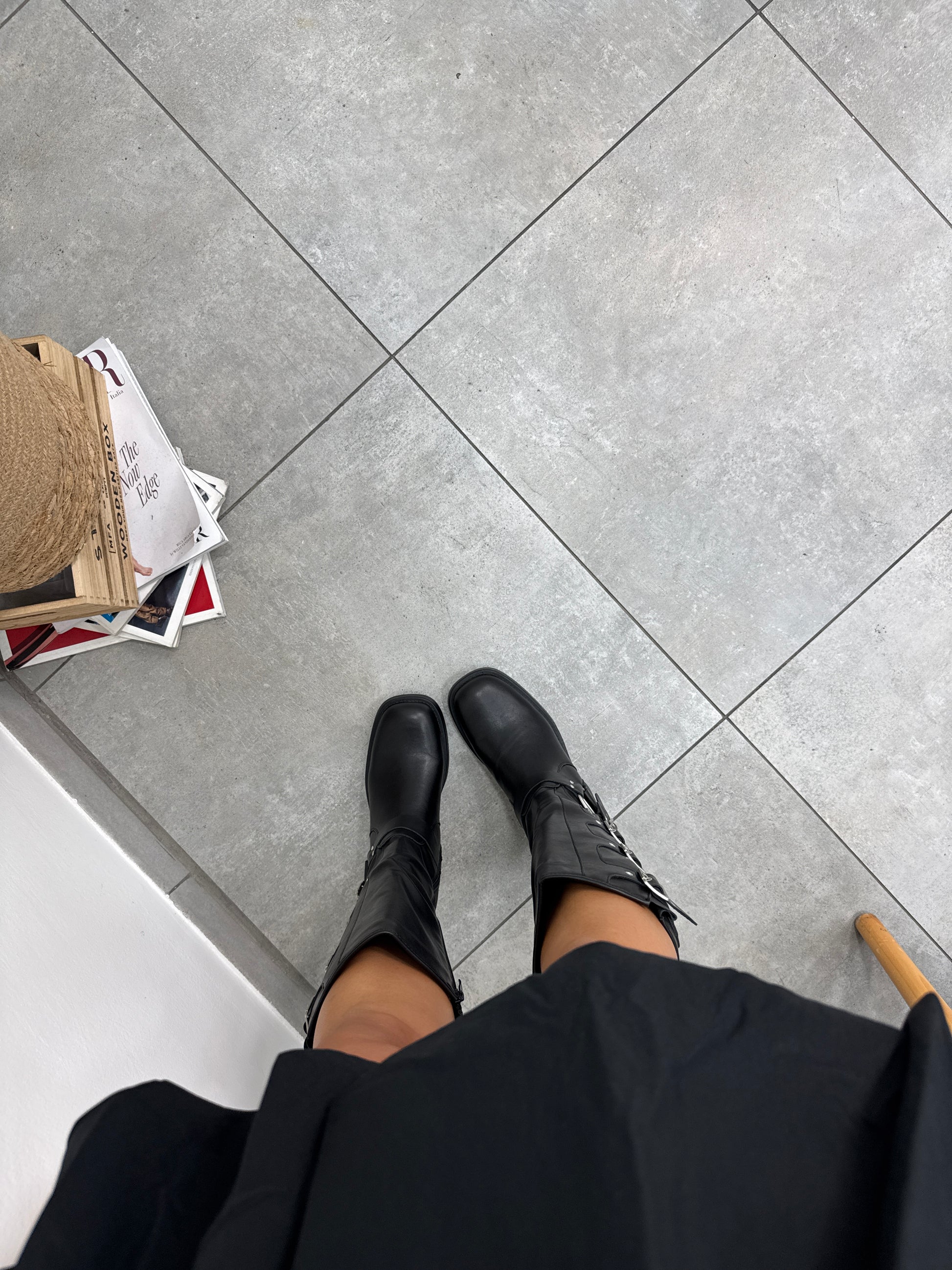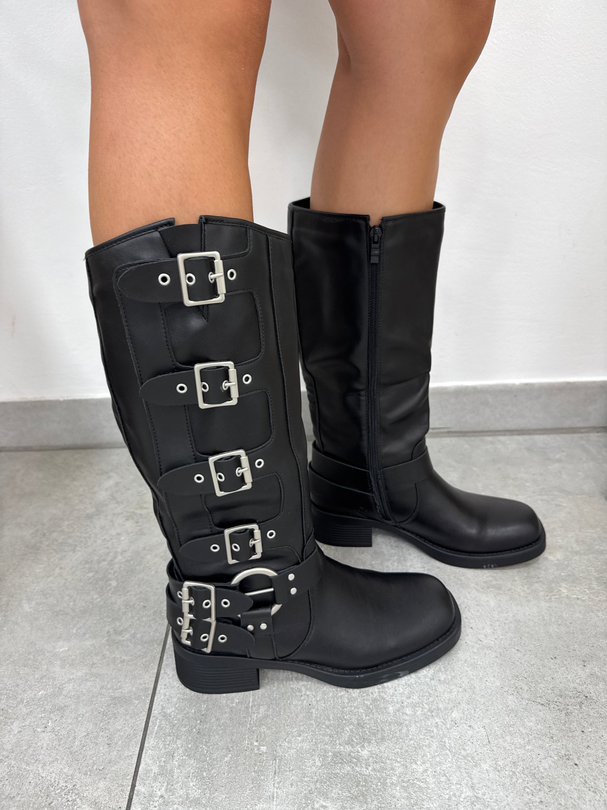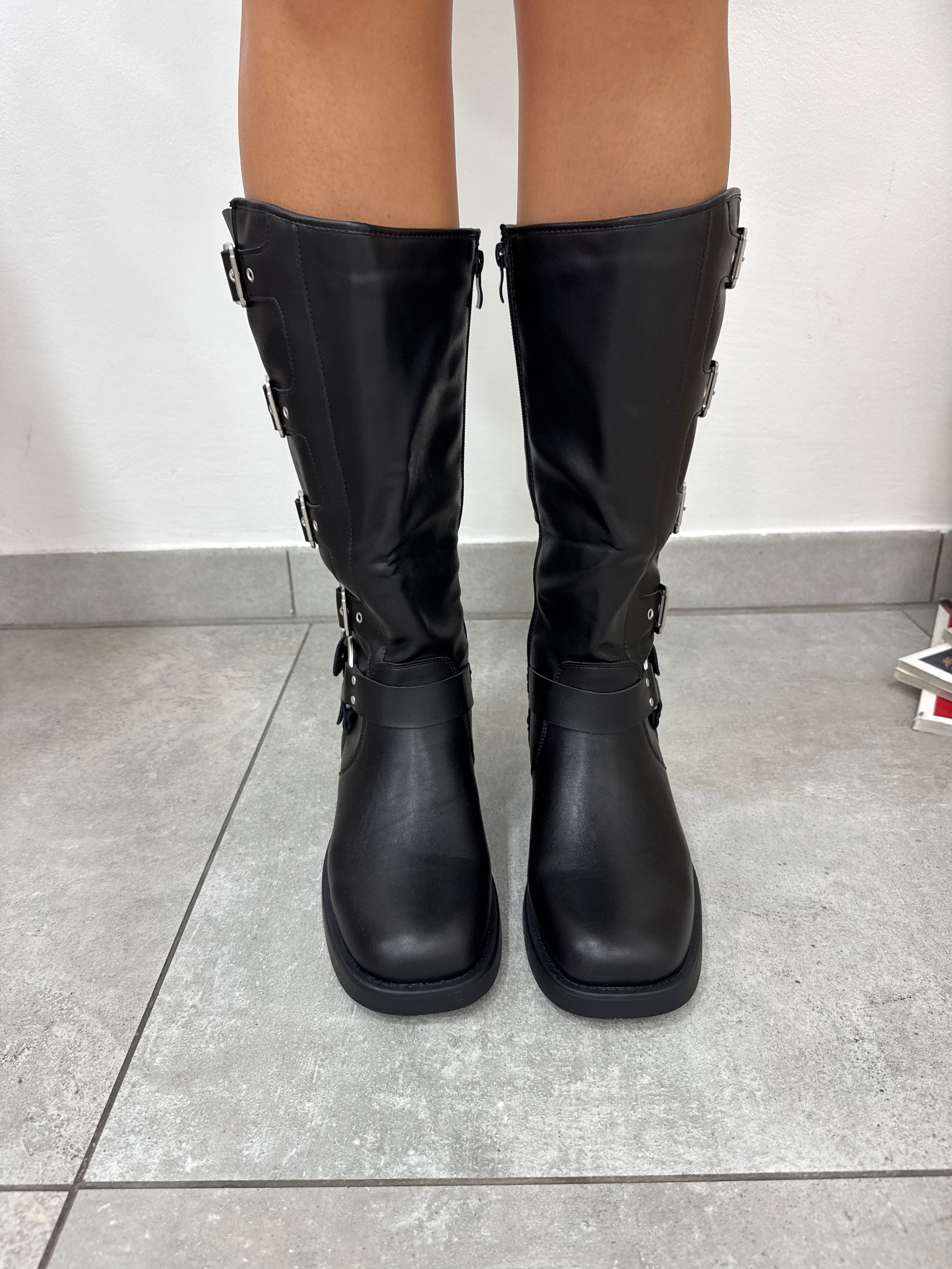 Stivali biker ecopelle con fibbie grigie, lampo laterale, punta squadrata. Tacco circa 4 cm.