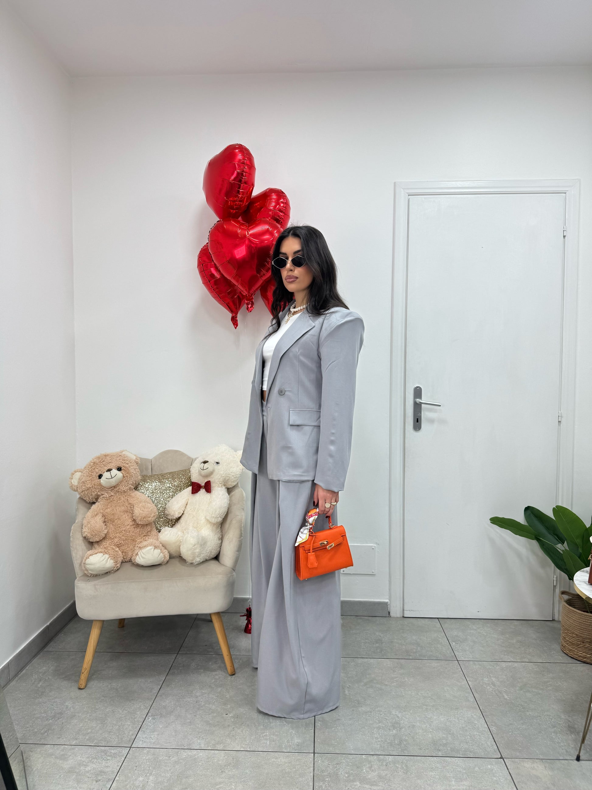 Tailleur - completo composto da blazer over doppiopetto con spalline imbottite e pantalone palazzo con chiusura spostata e pences, elastico in vita.