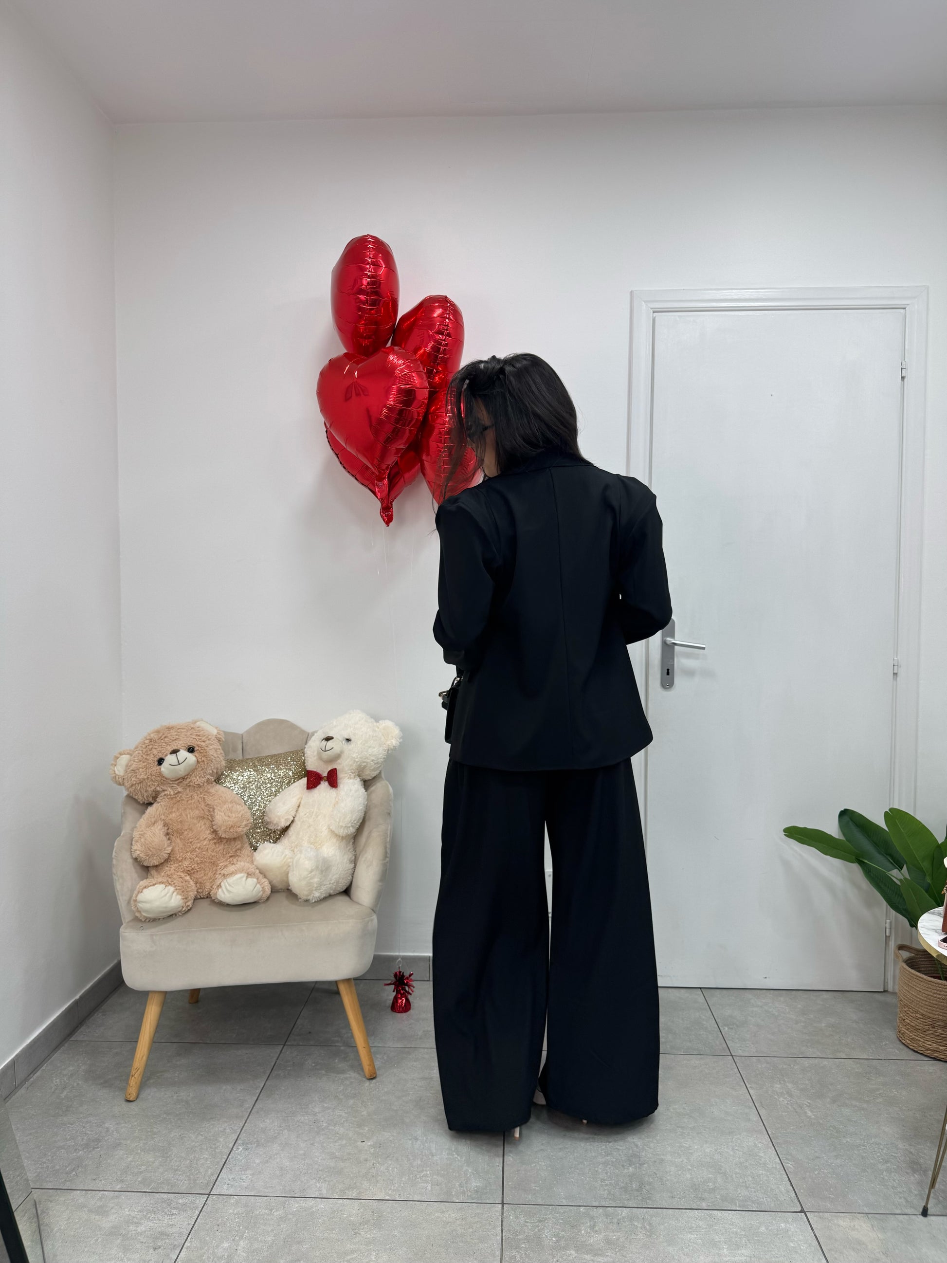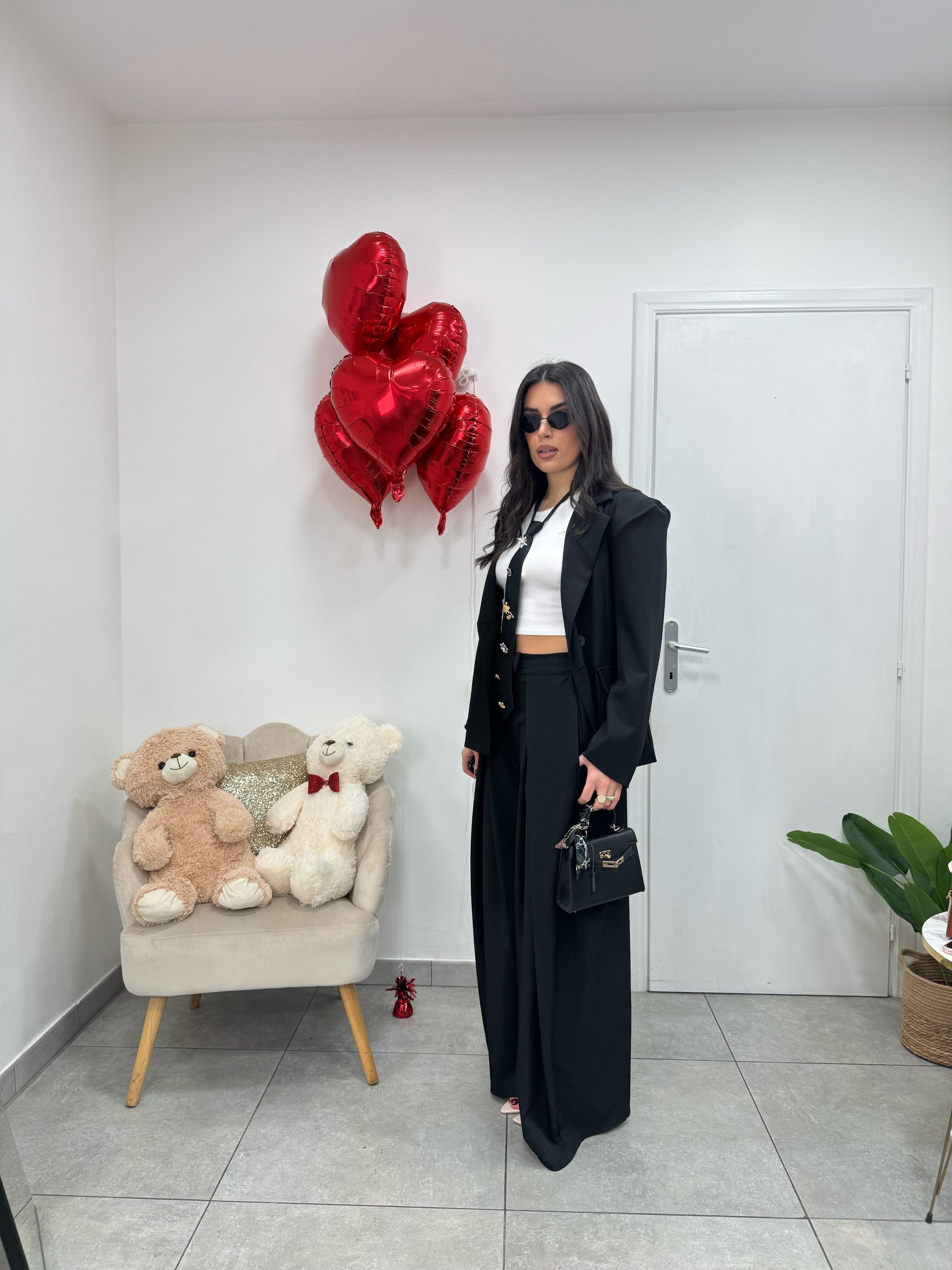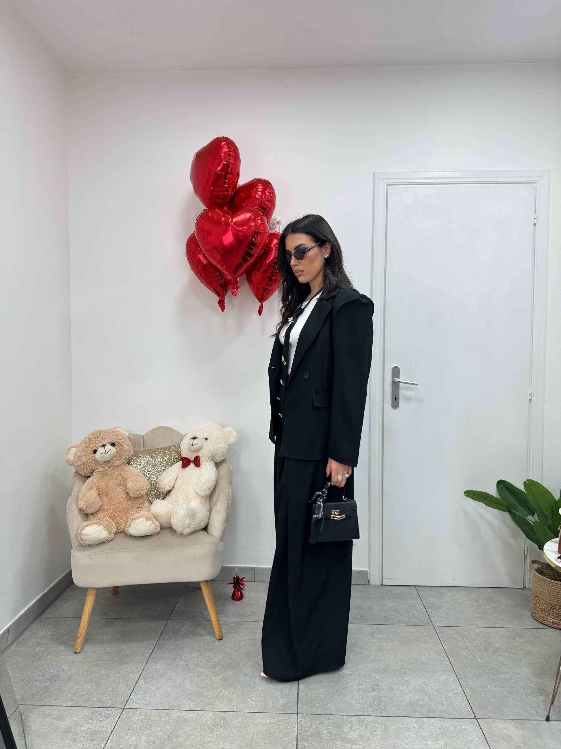 Tailleur - completo composto da blazer over doppiopetto con spalline imbottite e pantalone palazzo con chiusura spostata e pences, elastico in vita.