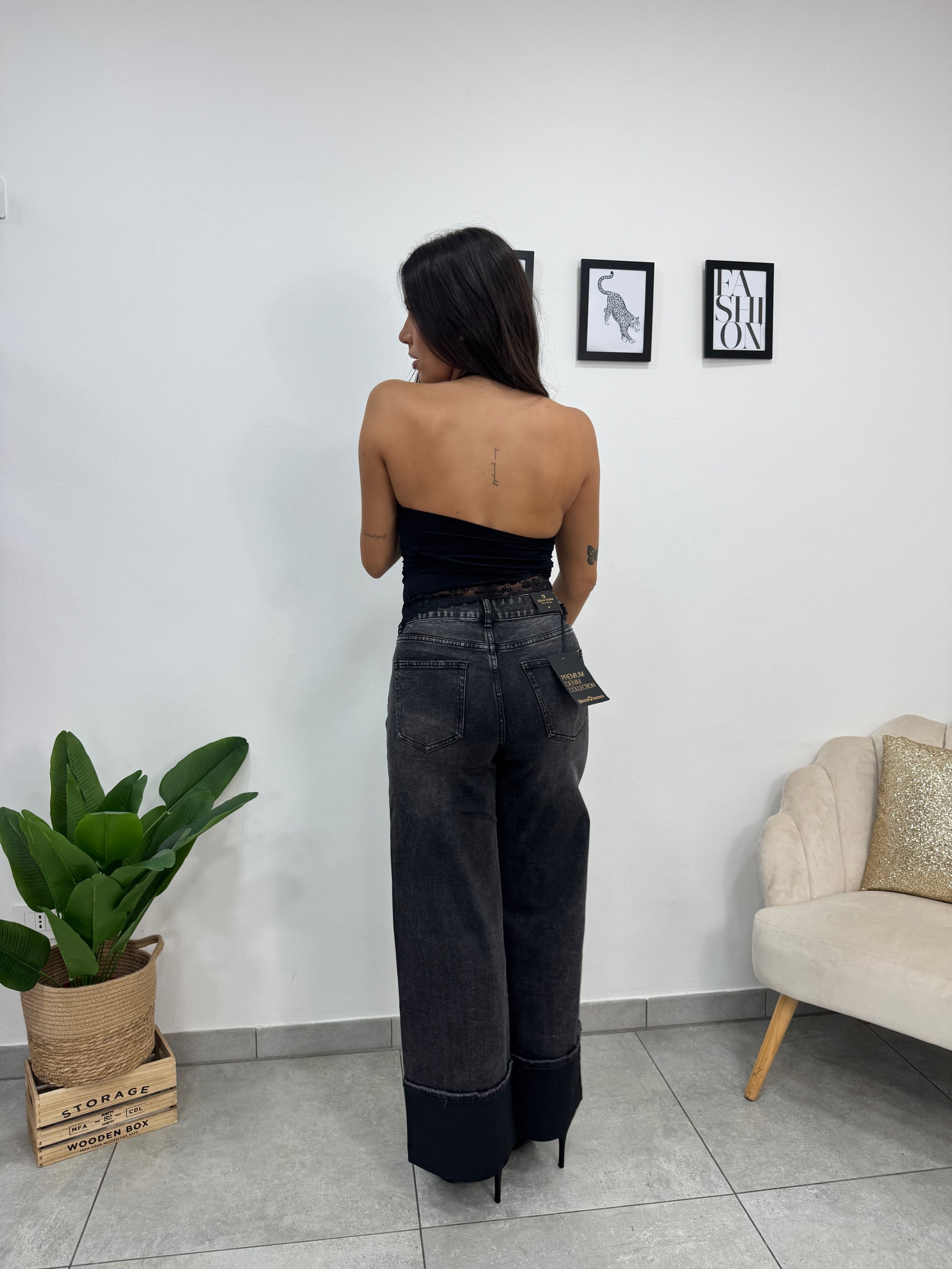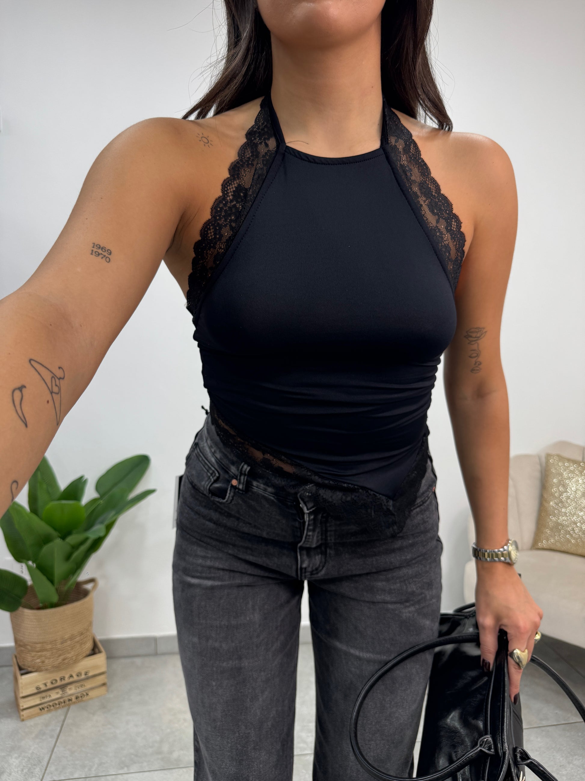 Top asimmetrico con bordo in pizzo, scollo all’americana e taglio sbiego.