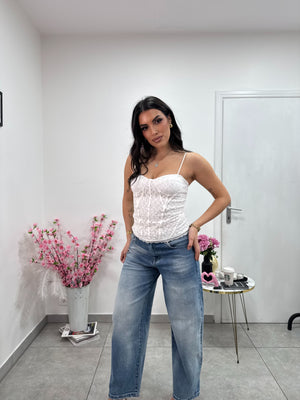 Top scollato in pizzo effetto steccato, coppe preformate, spalline elastiche regolabili. Orlo finale in merletto.